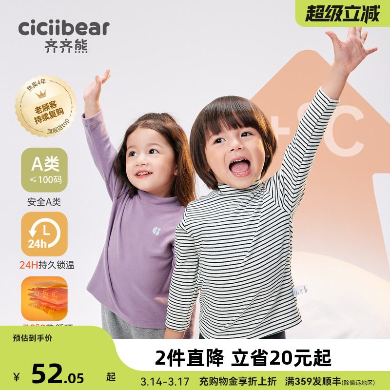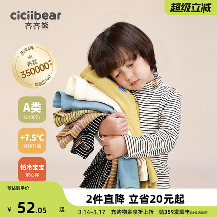 [发热]齐齐熊男童打底衫冬款宝宝条纹儿童半高领T恤童装女童纯色