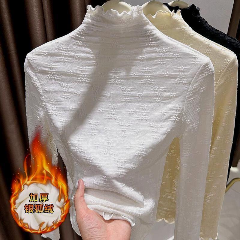 高领加绒蕾丝打底衫女秋冬洋气内搭2024新款加厚木耳边网纱小衫潮