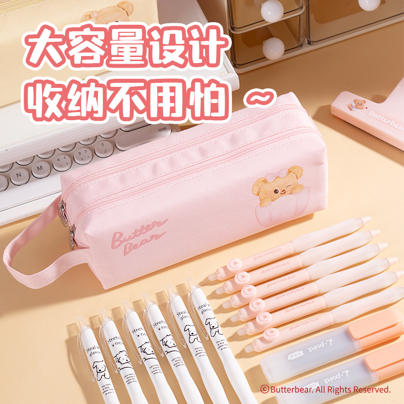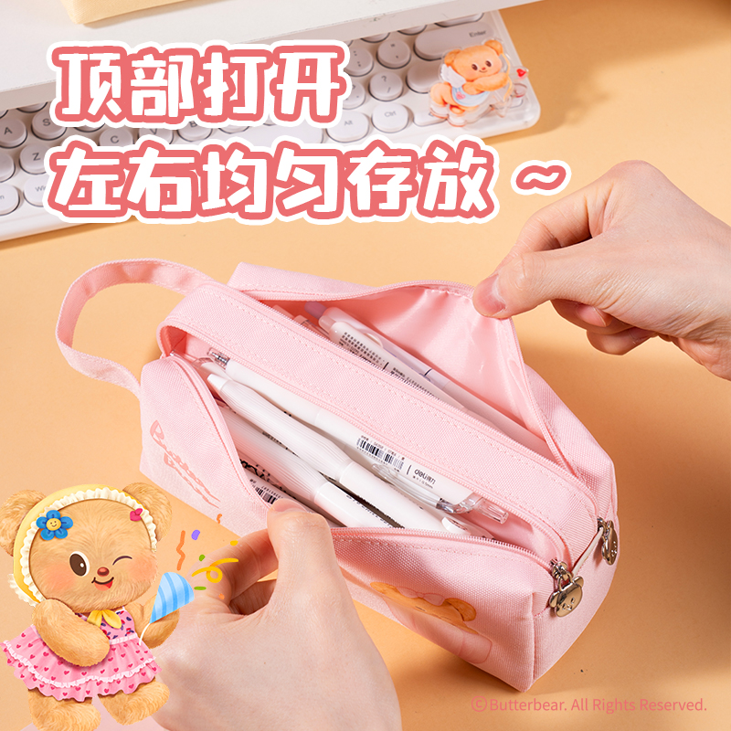 得力HY718黄油小熊双拉链大方包笔袋可爱学生高颜值大容量文具盒