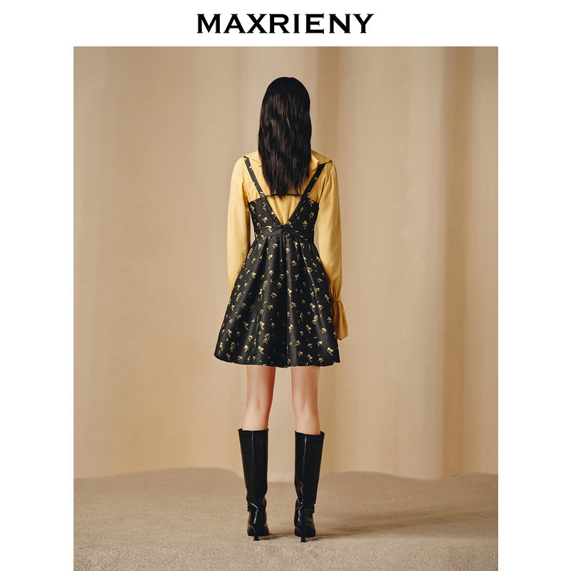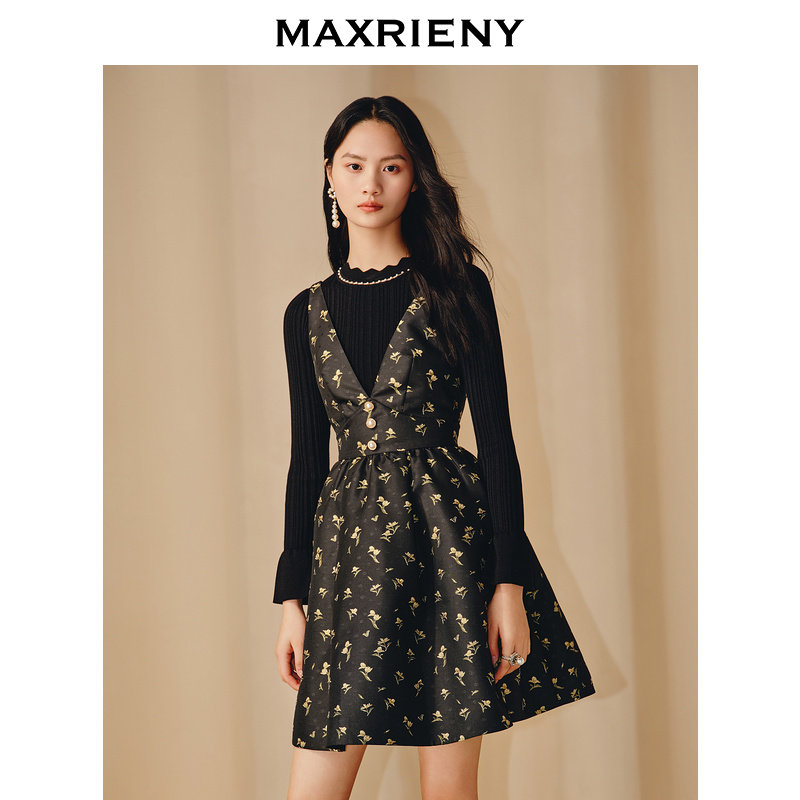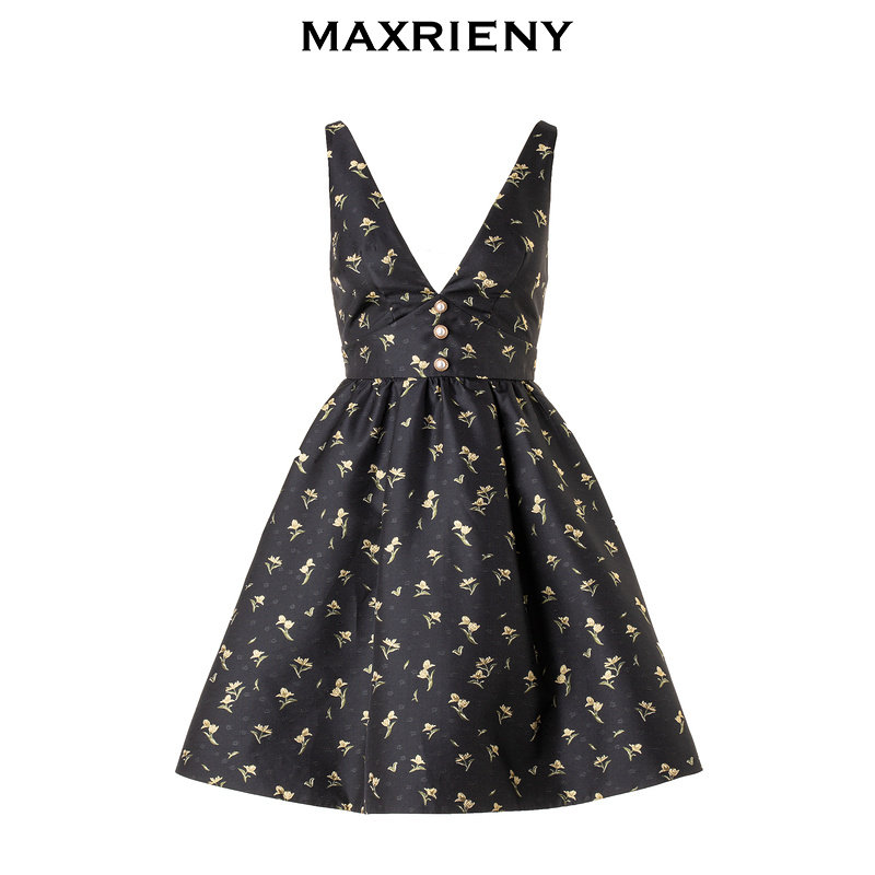 MAXRIENY宫廷复古郁金花提花背带大V领连衣裙小黑裙