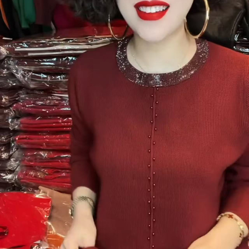 新款长袖百搭纯色显瘦套头打底衫女时尚银边圆领竖排钉珠针织上衣