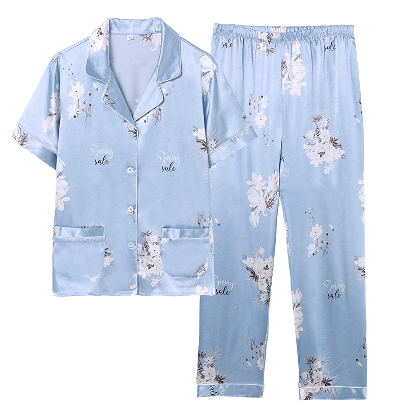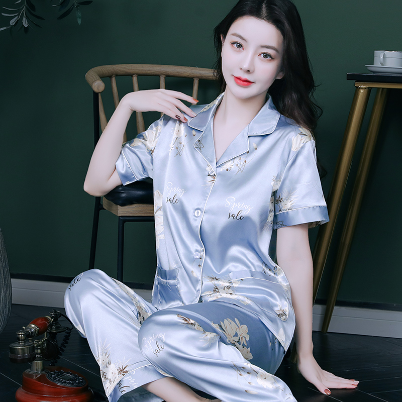 睡衣女夏季冰丝短袖长裤薄款夏天女士丝绸甜美夏款丝质家居服套装