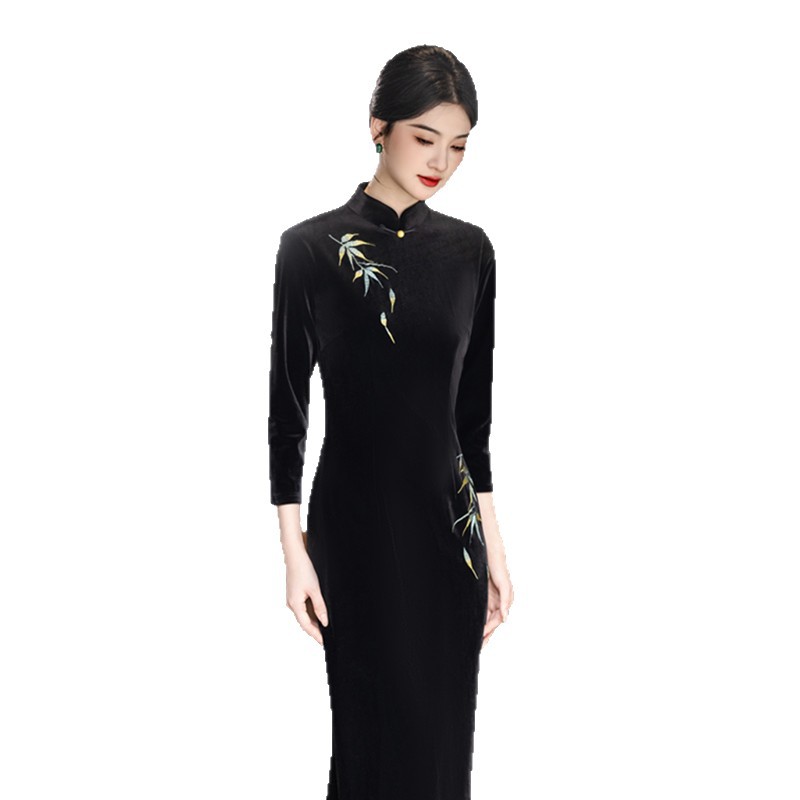 新式旗袍秋款中国风优雅气质长款丝绒显瘦修身中式连衣裙黑色优雅