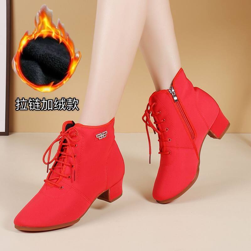 秋冬季高帮牛津布舞蹈鞋女软底广场舞鞋交谊水兵舞靴拉链加绒红色