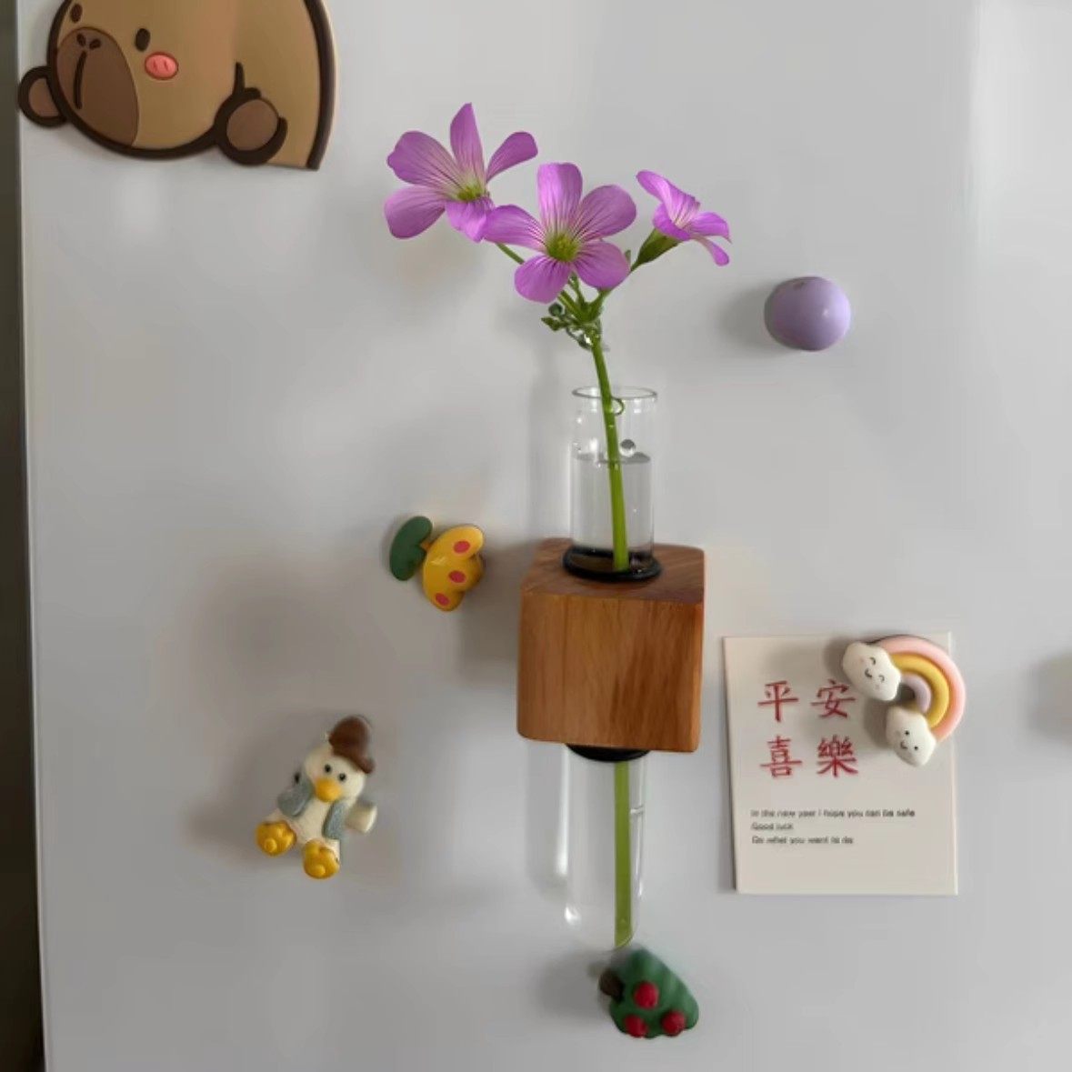 冰箱贴花瓶黏贴磁吸插花器实木中古风可养鲜花水培植物试管小花瓶