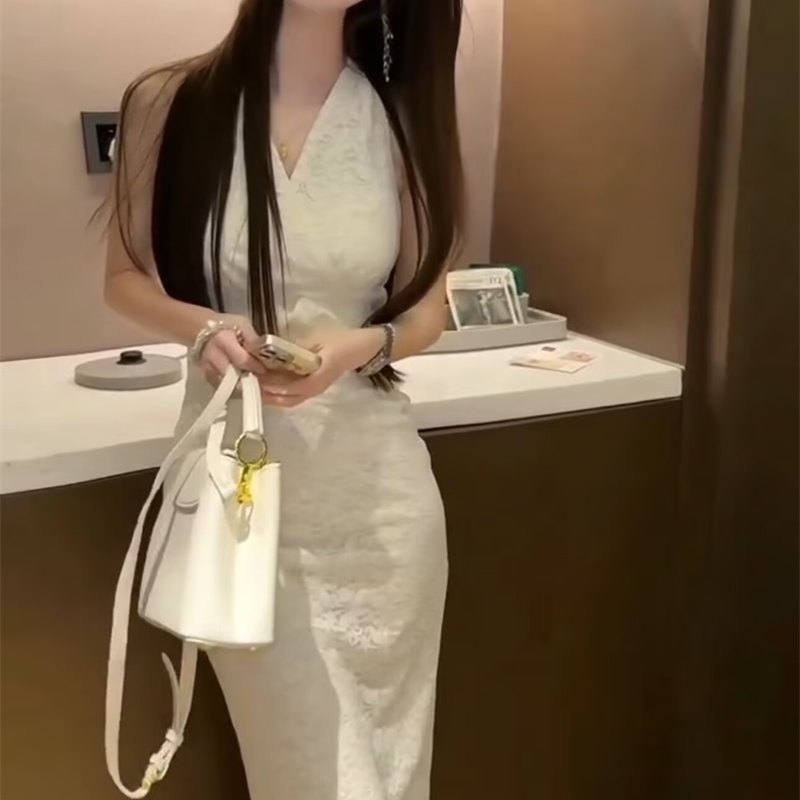 法式高级感修身蕾丝挂脖v领连衣裙女夏季时尚气质性感亮丝长裙