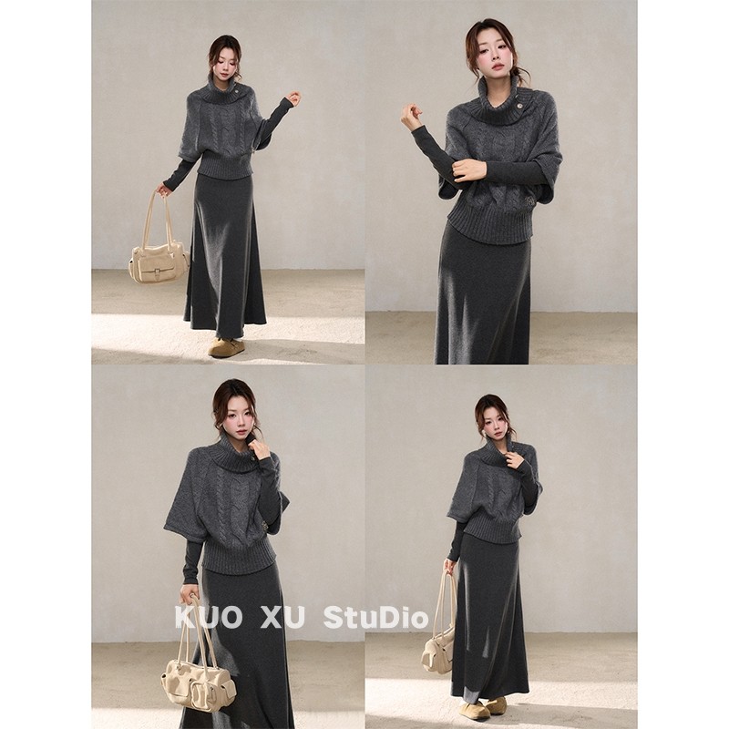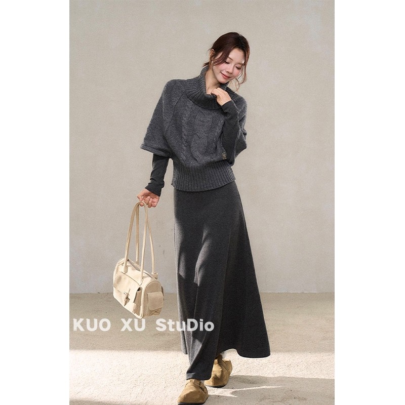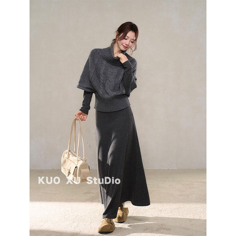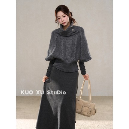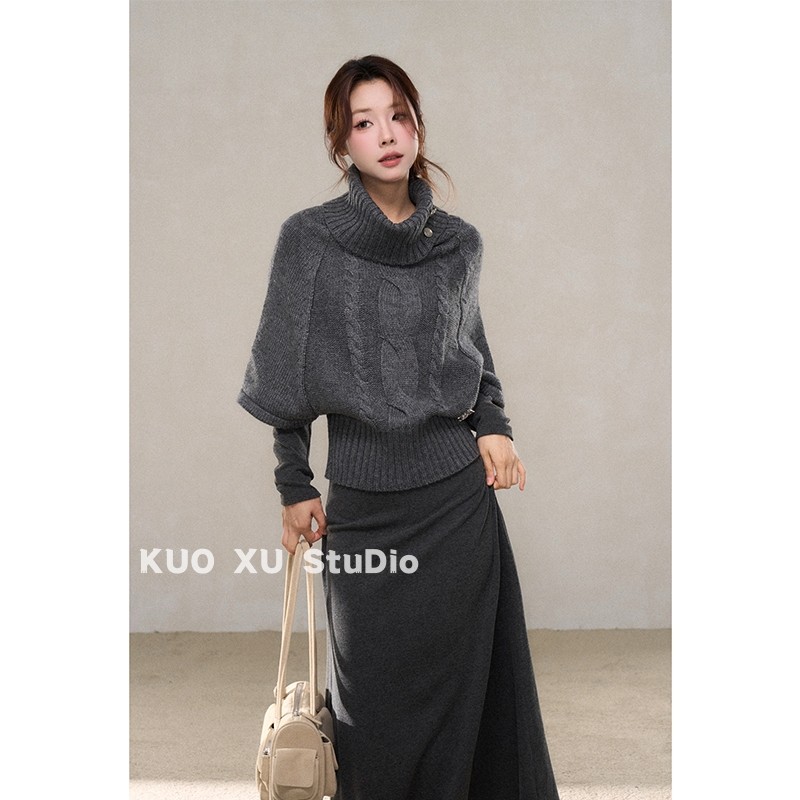 秋冬穿搭韩版灰色针织衫女麻花套头斗篷毛衣慵懒高领百搭长袖上衣