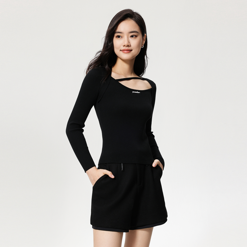飘蕾黑色长袖毛衣冬季新款字母绑带设计修身显瘦百搭针织衫女