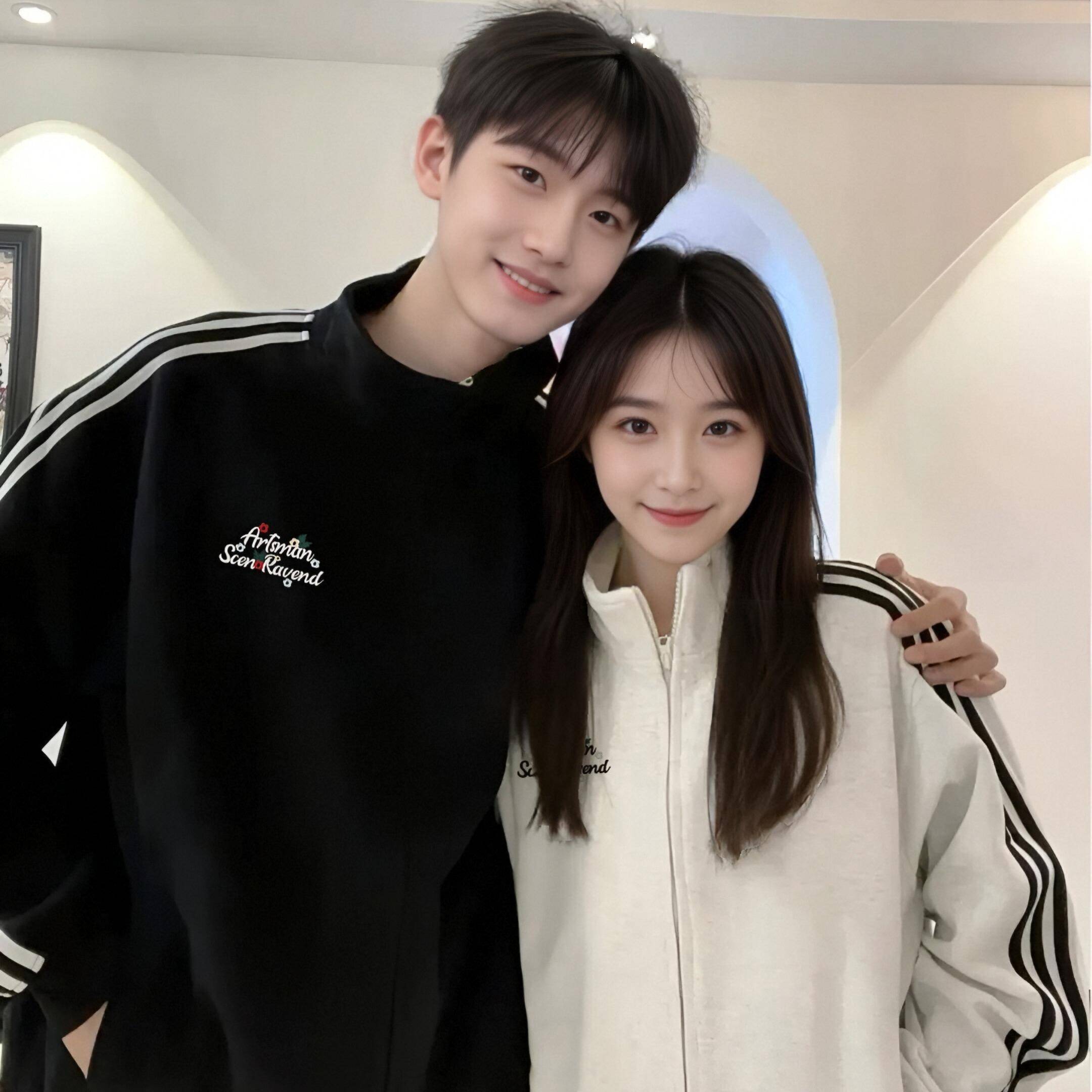 休闲卫衣开衫情侣装秋冬季2025新款美式复古三条杠立领拉链外套女