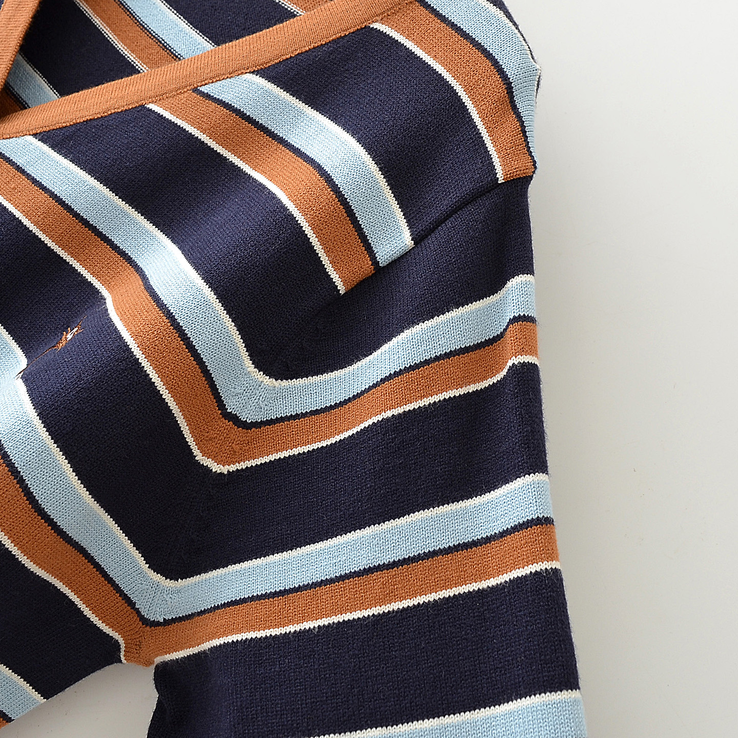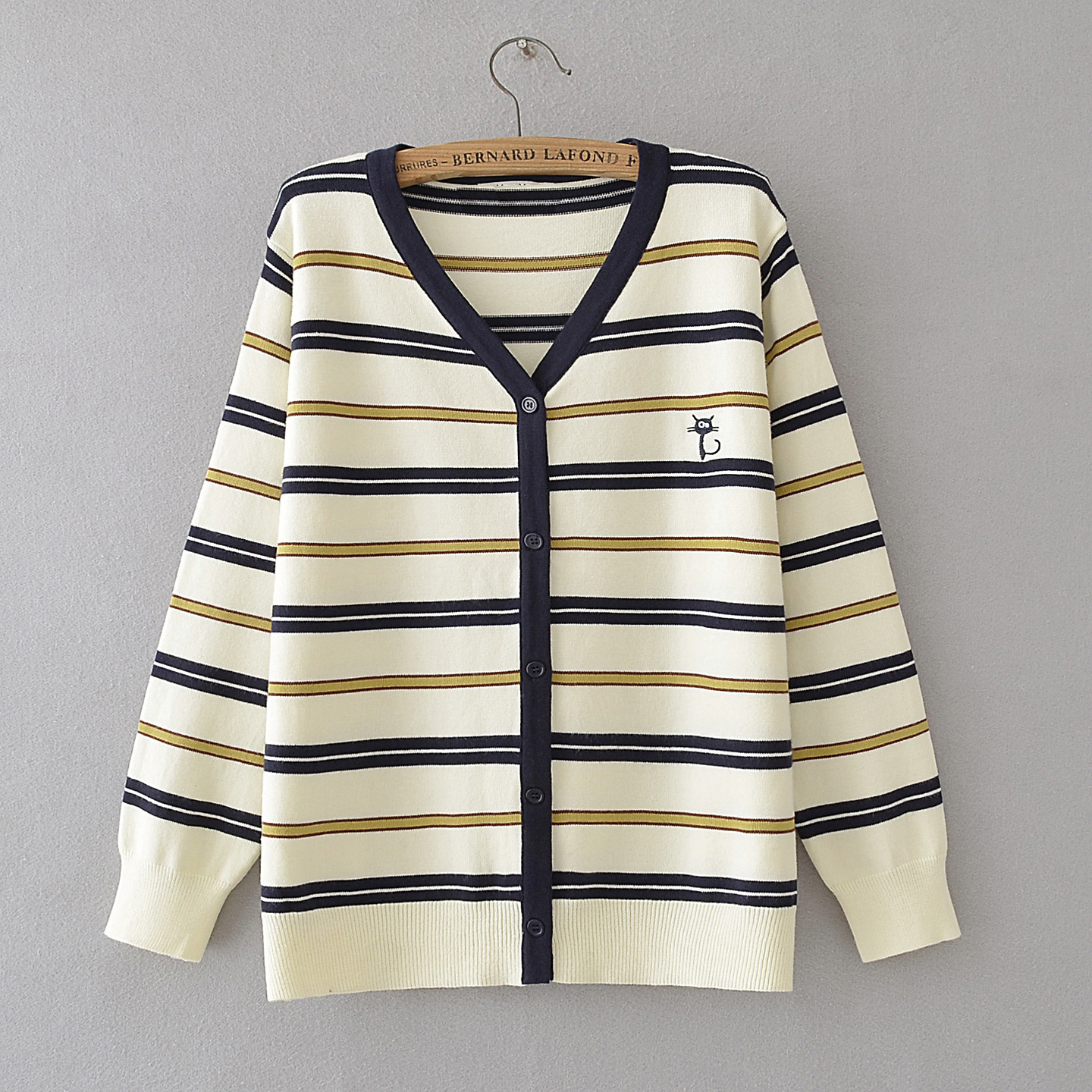 大码女装秋冬新款休闲V领条纹针织开衫女长袖显瘦毛衣外套学院风