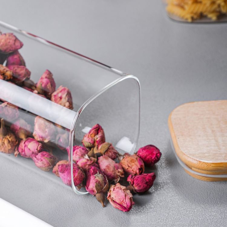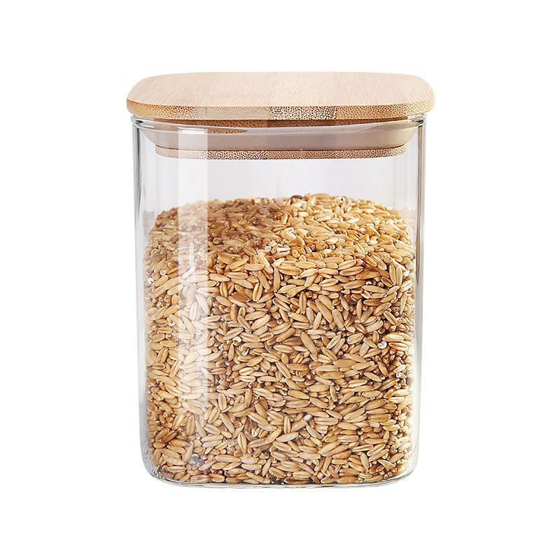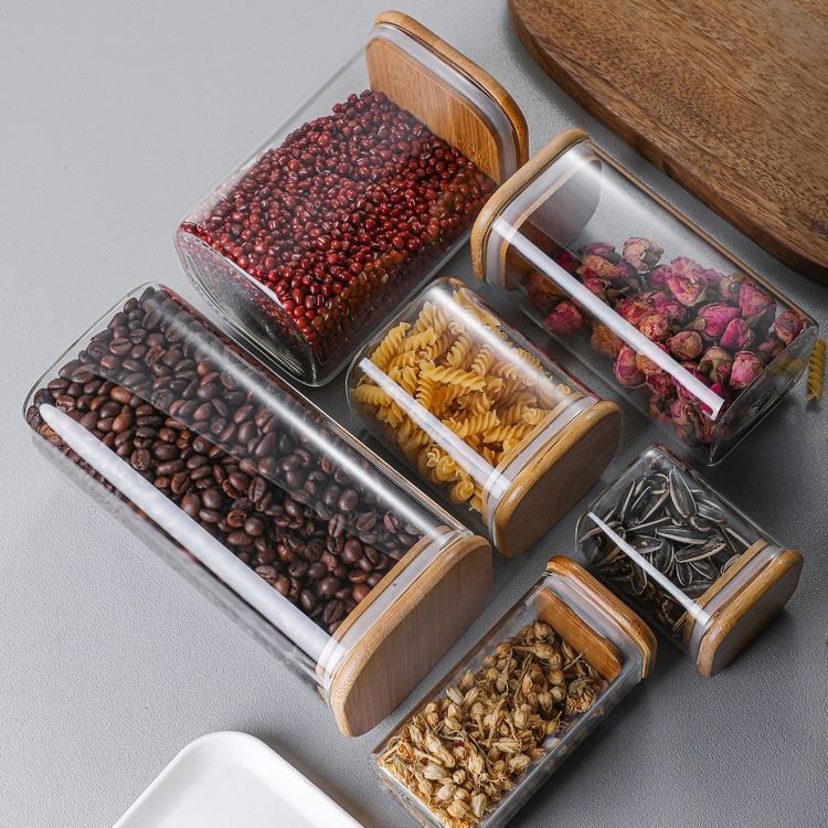 竹盖高硼硅玻璃茶叶罐 方形透明玻璃厨房香料坚果密封储物罐