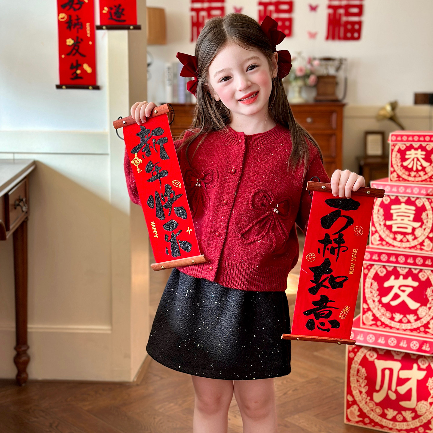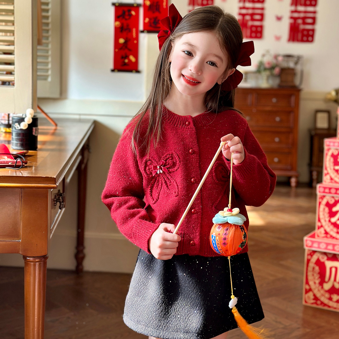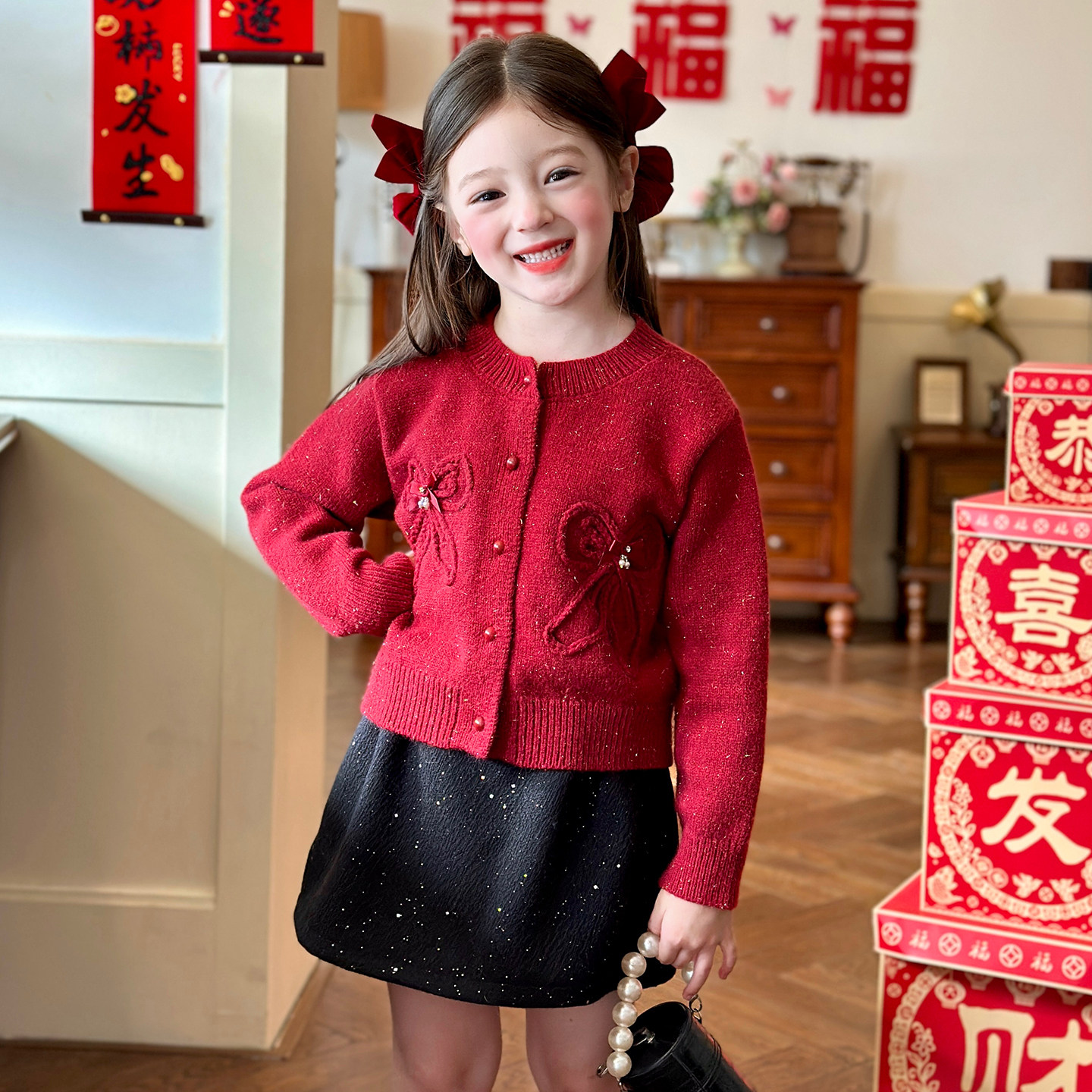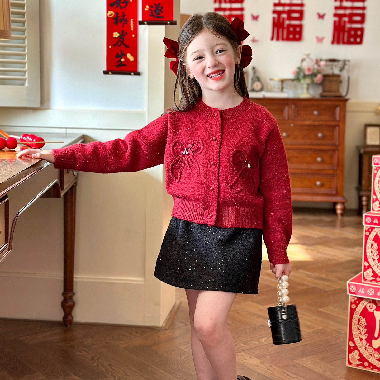 栀了成长记童装女童韩版红色针织上衣2025冬季儿童蝴蝶结新年毛衣