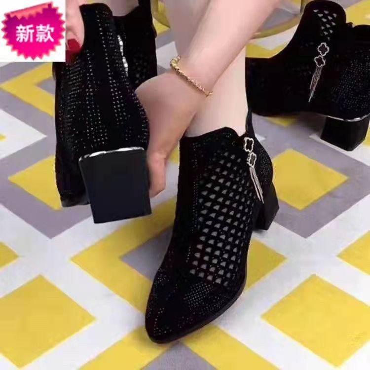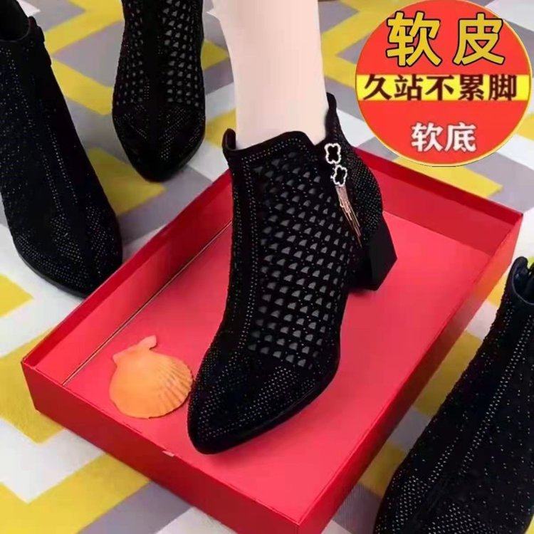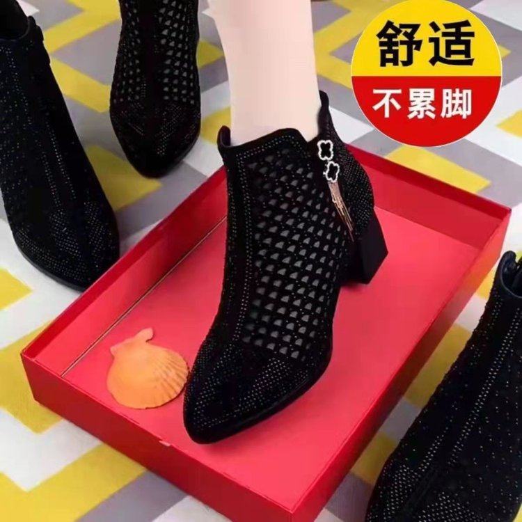 大东妞品牌断码清仓春夏新款真皮妈妈网纱镂空短靴粗跟透气水钻凉