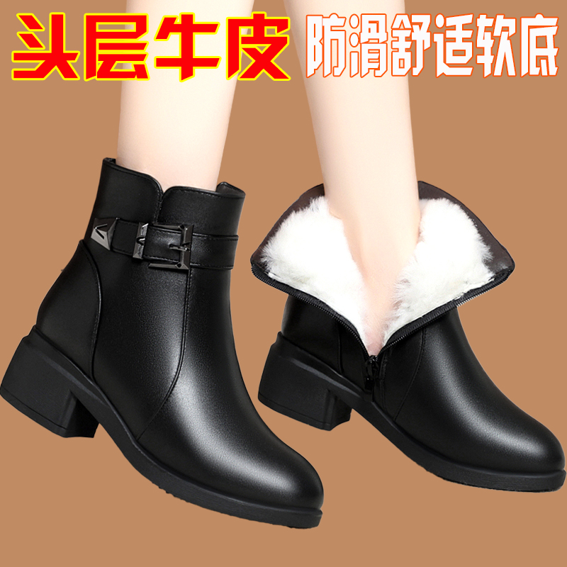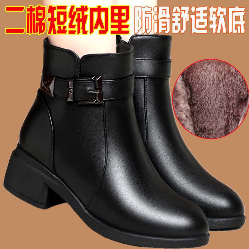 佑家路真皮粗跟短靴短筒舒适显瘦春秋单靴新款中跟马丁靴妈妈鞋