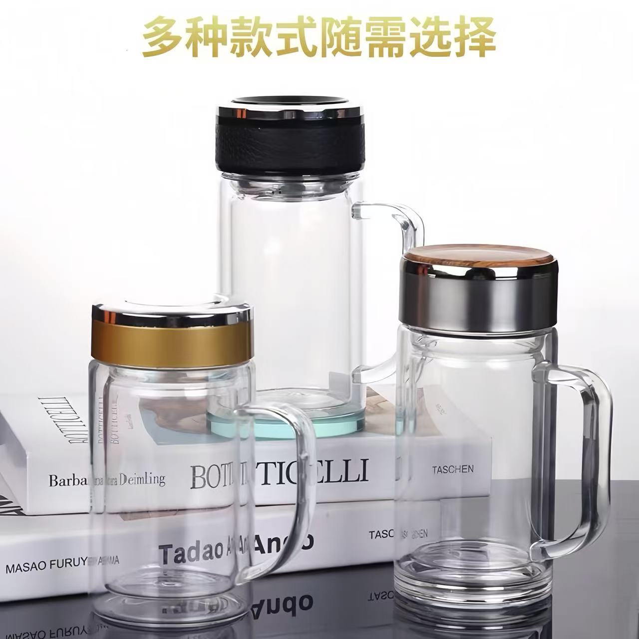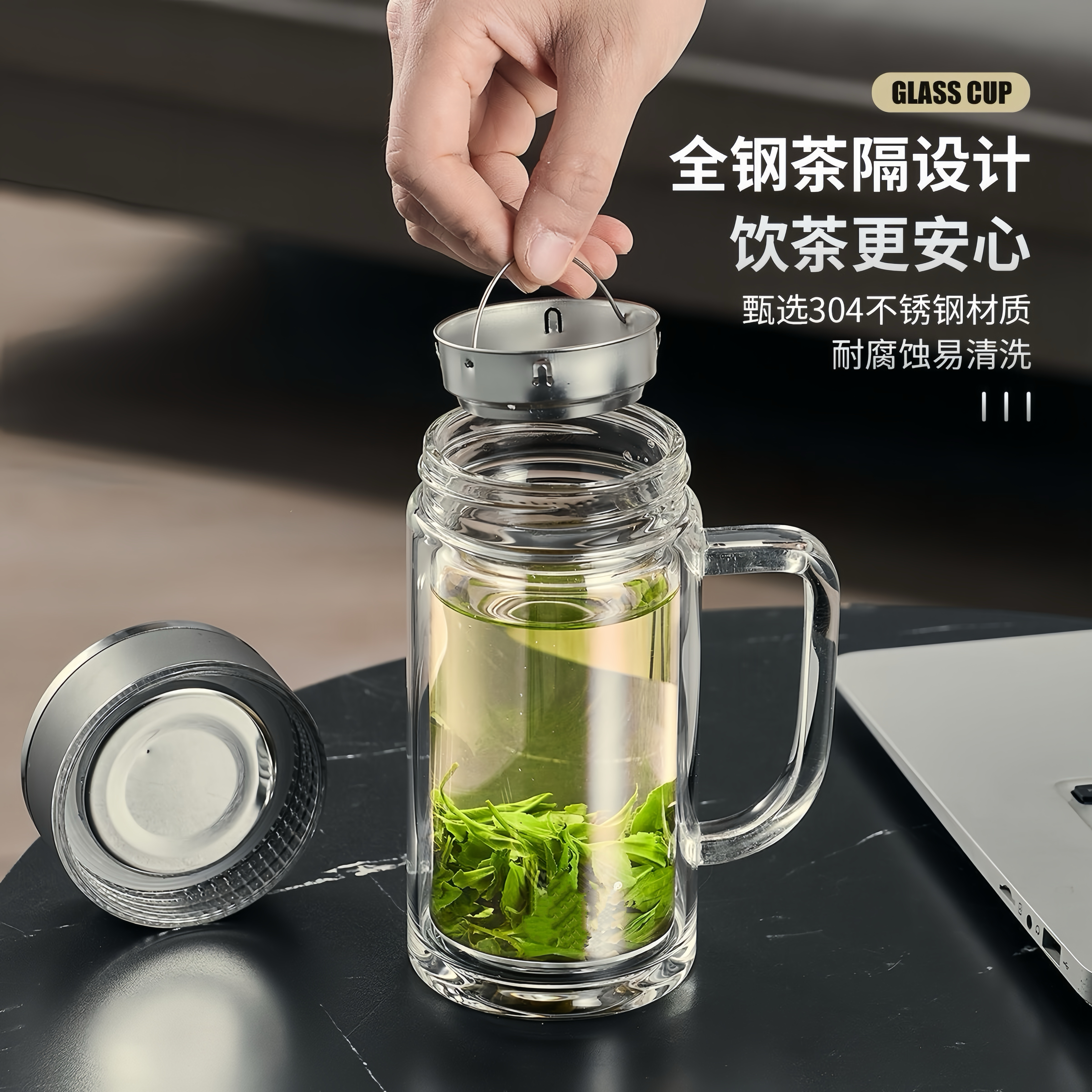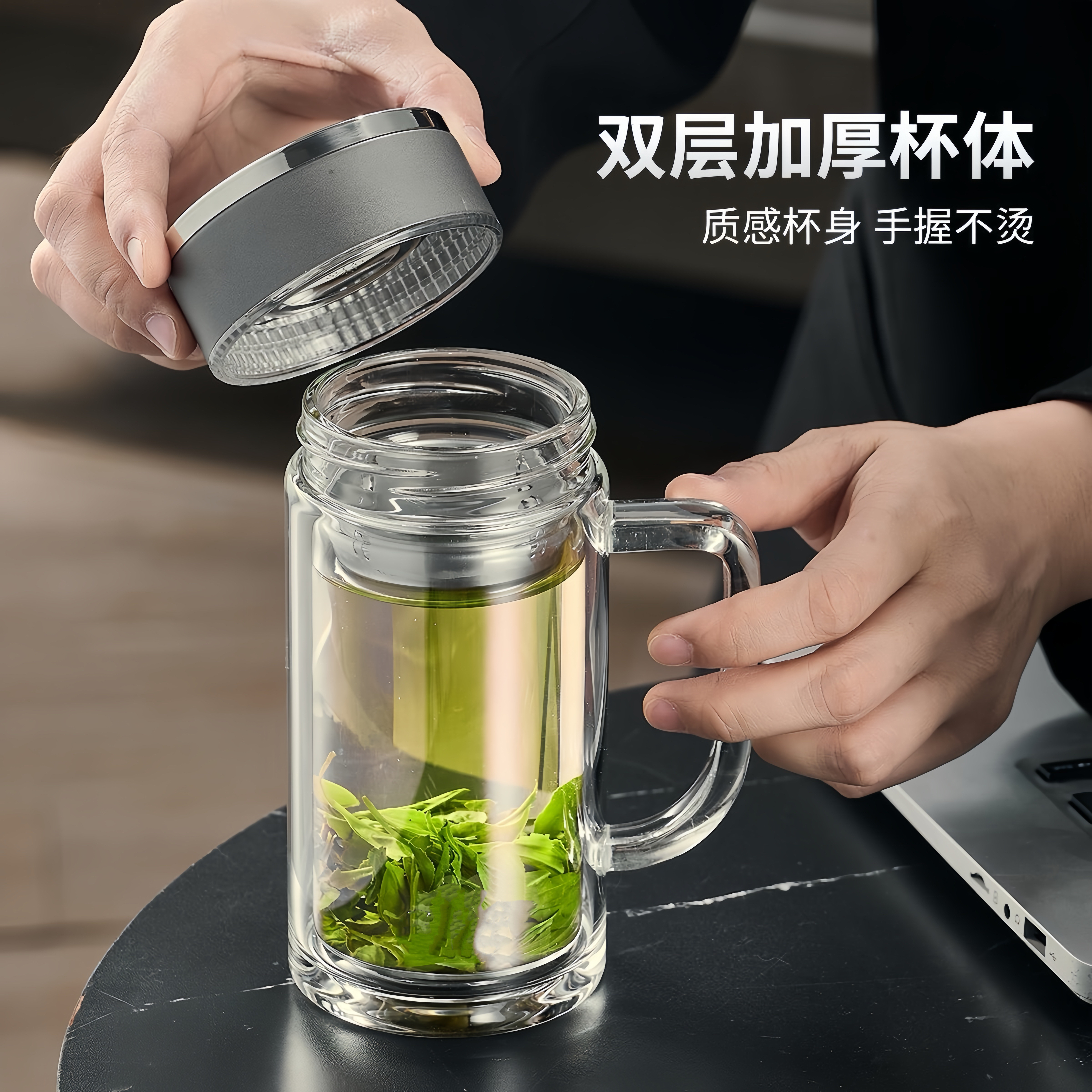 玻璃杯茶杯男士泡茶专用水杯茶水分离带把手双层玻璃杯家用喝水杯
