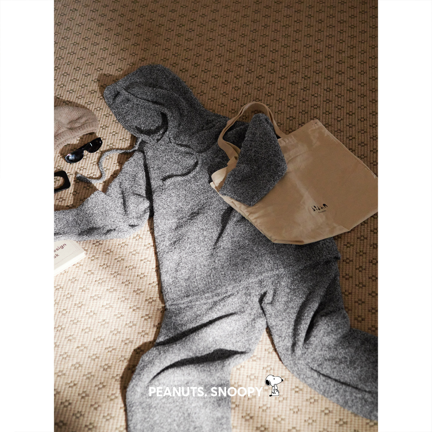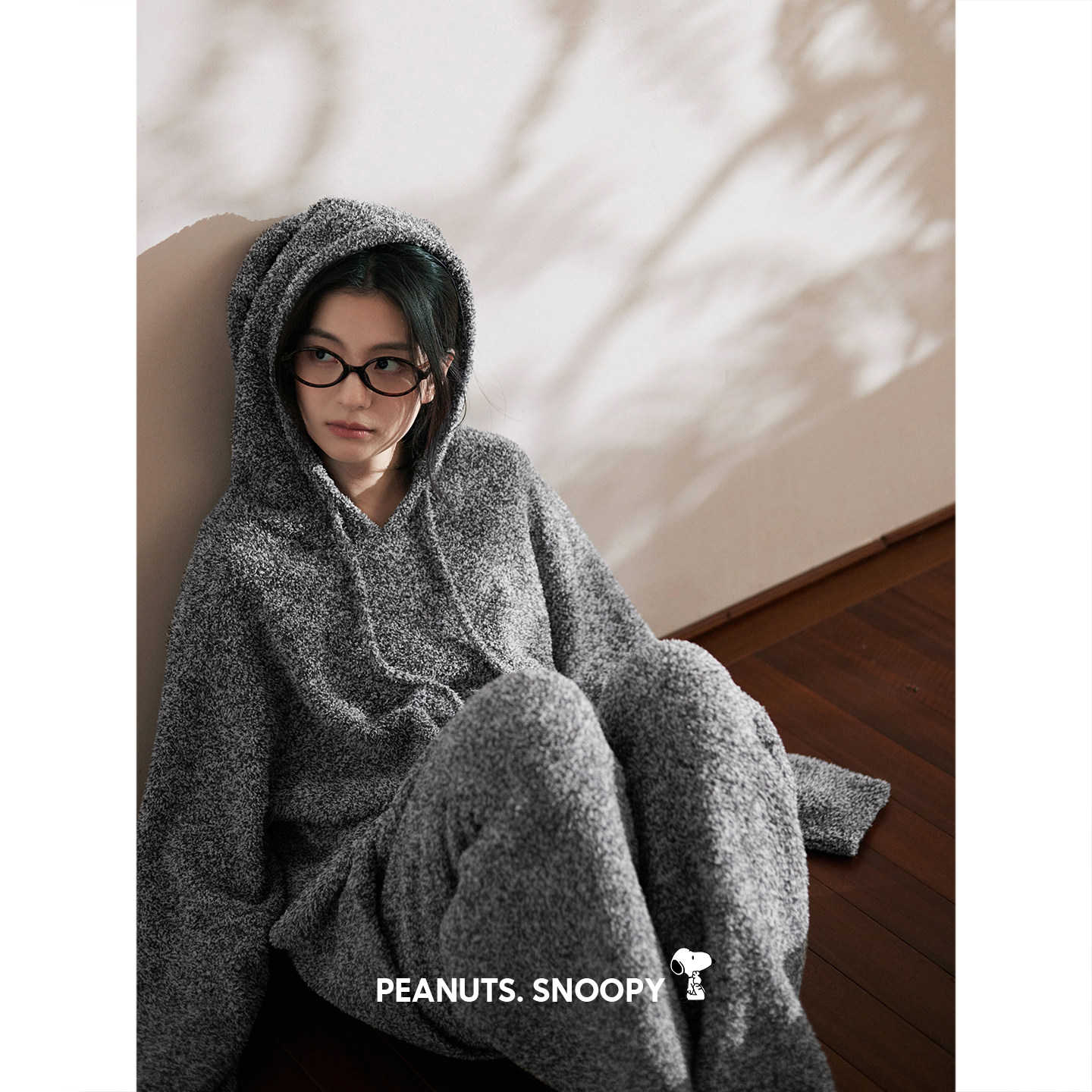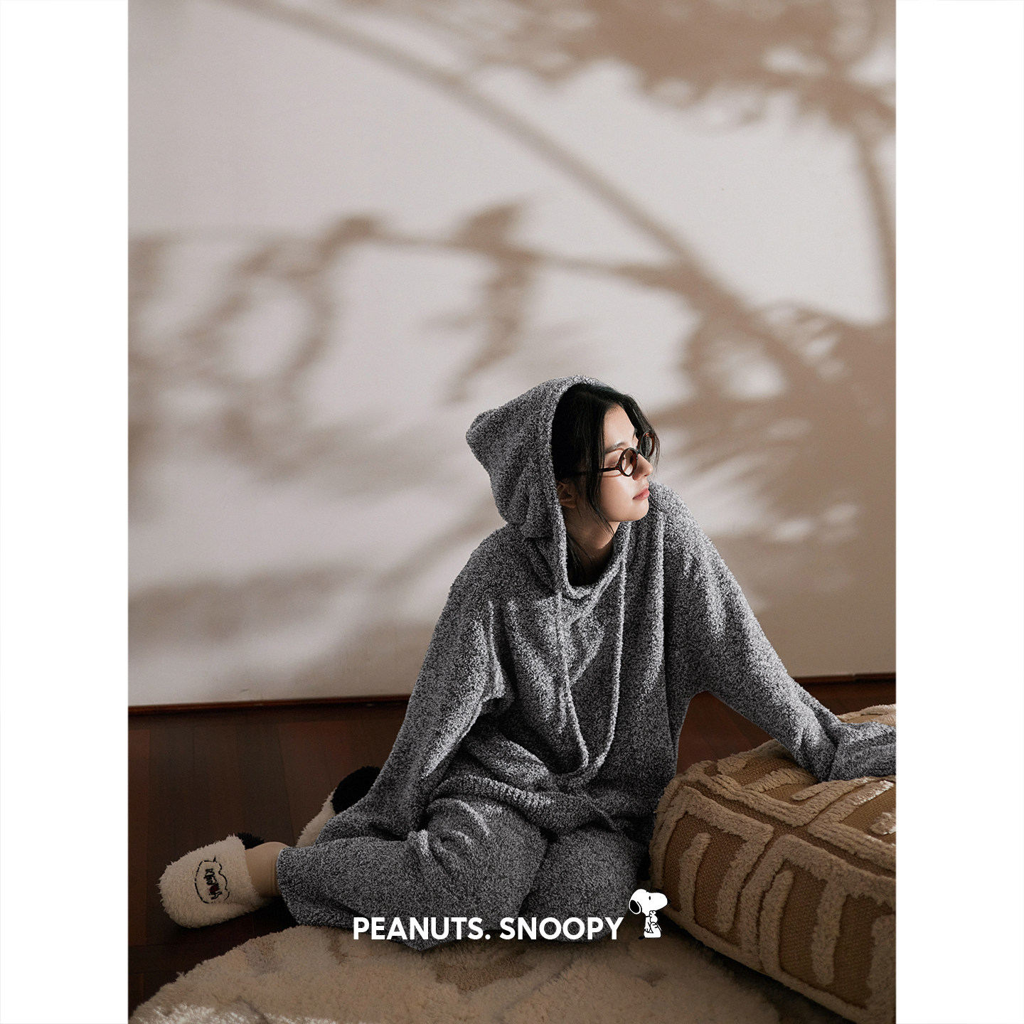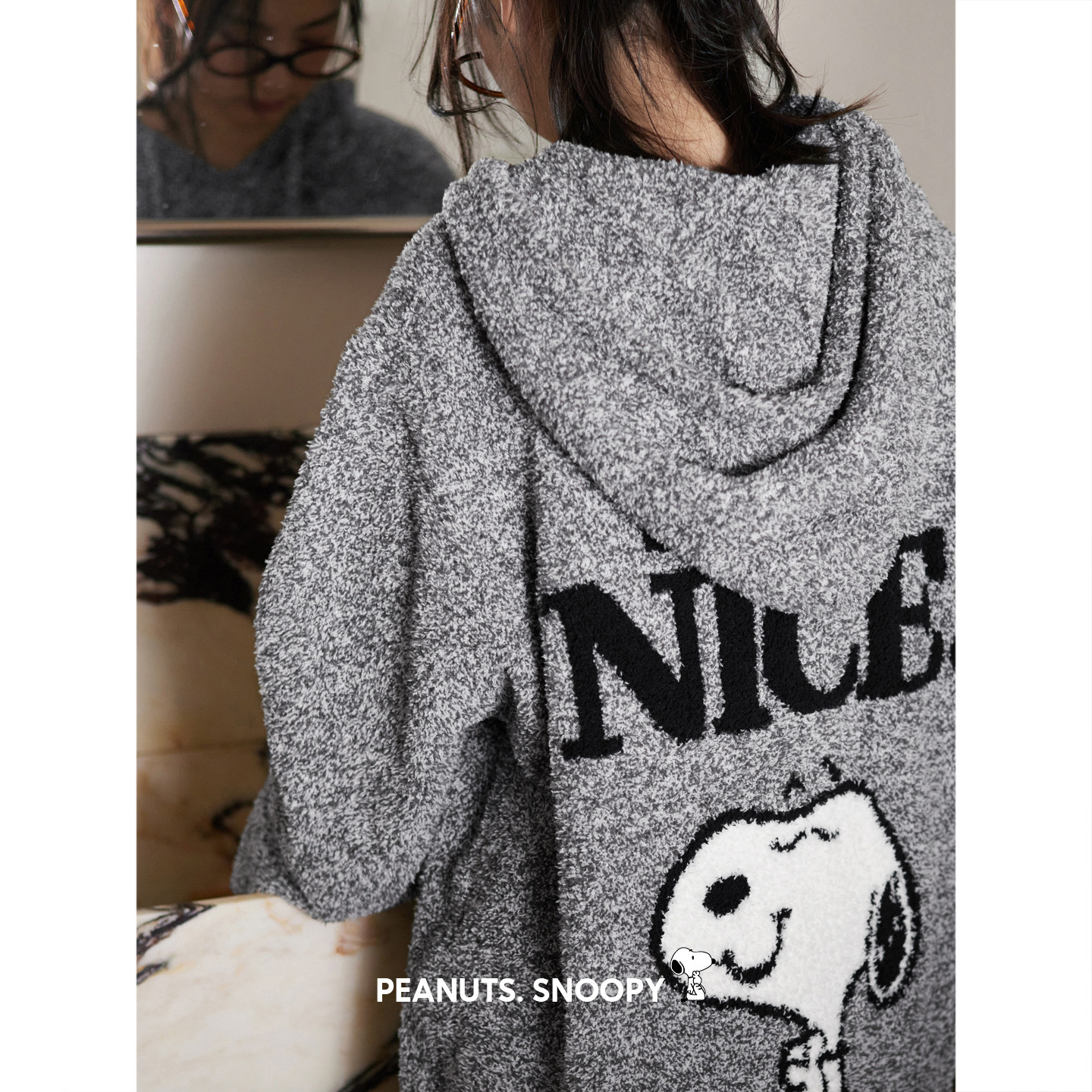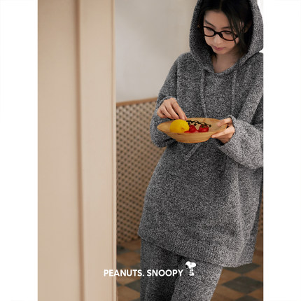 贝妍史努比女款半边绒睡衣秋冬保暖珊瑚绒套装宽松外穿连帽家居服