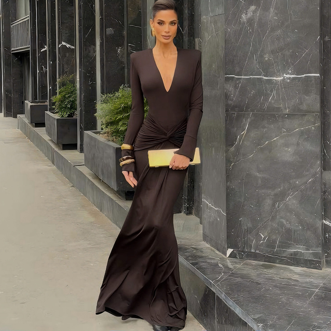 WEIRD PUSS 御姐干练气质深V褶皱扭结长袖连衣裙女 修身显瘦长裙