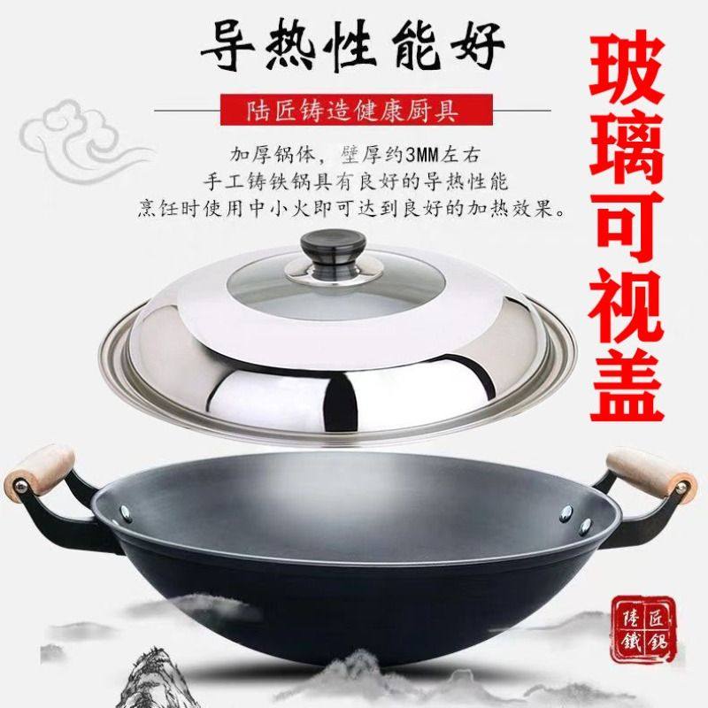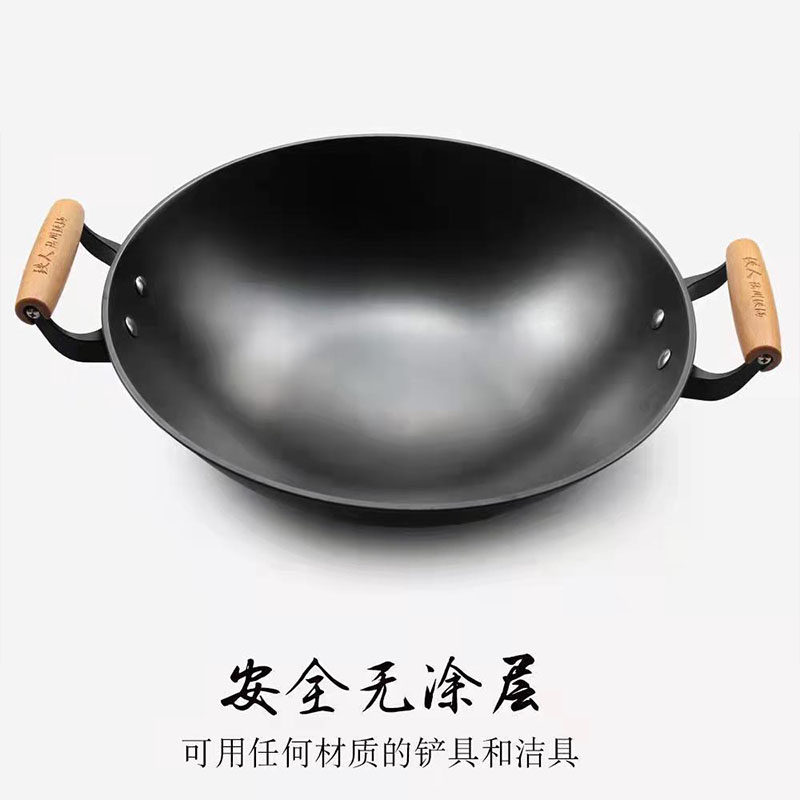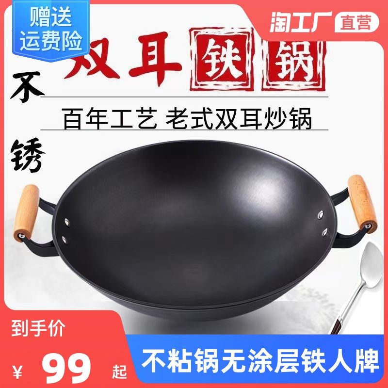 正宗陆川铁人牌沾锅无涂层物理粘老式家用耳铁锅铸铁炒锅