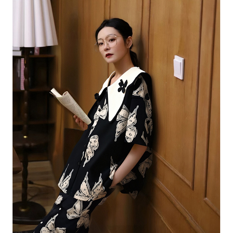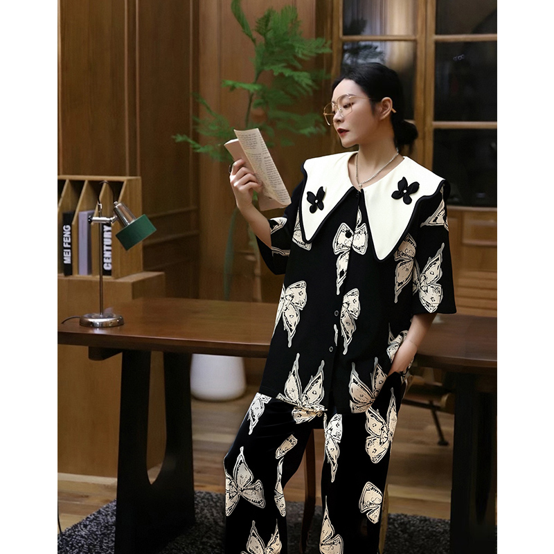 纯棉睡衣女夏季短袖长裤卡通奢华高级感黑色家居服可外穿甜美套装