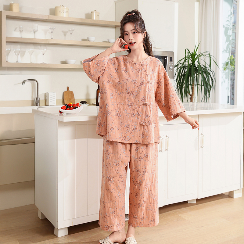 大码胖mm200斤新中式国风女睡衣夏季薄款纯棉九分裤胖妹妹家居服