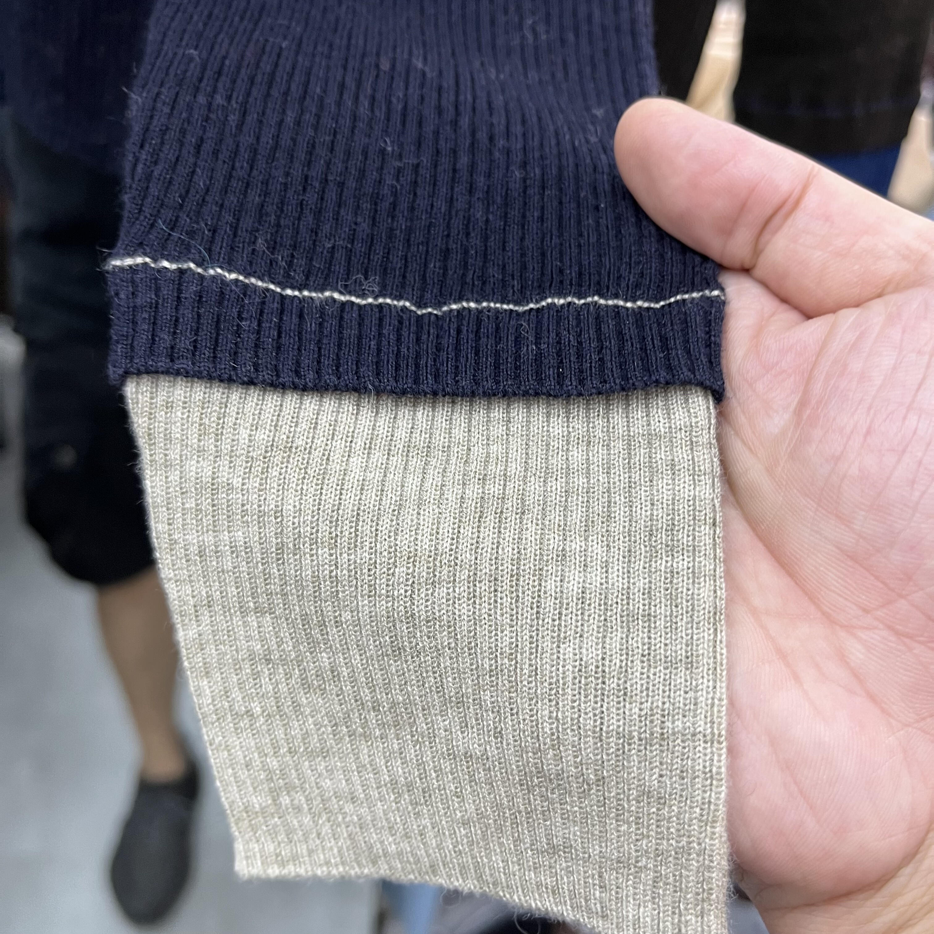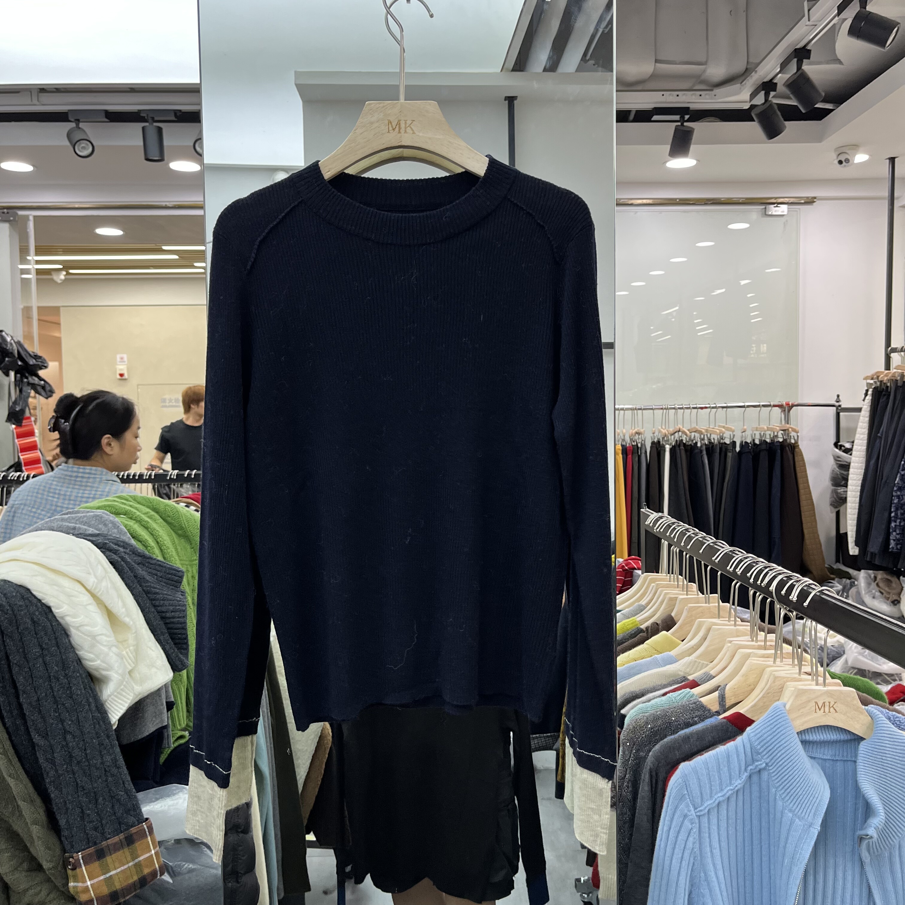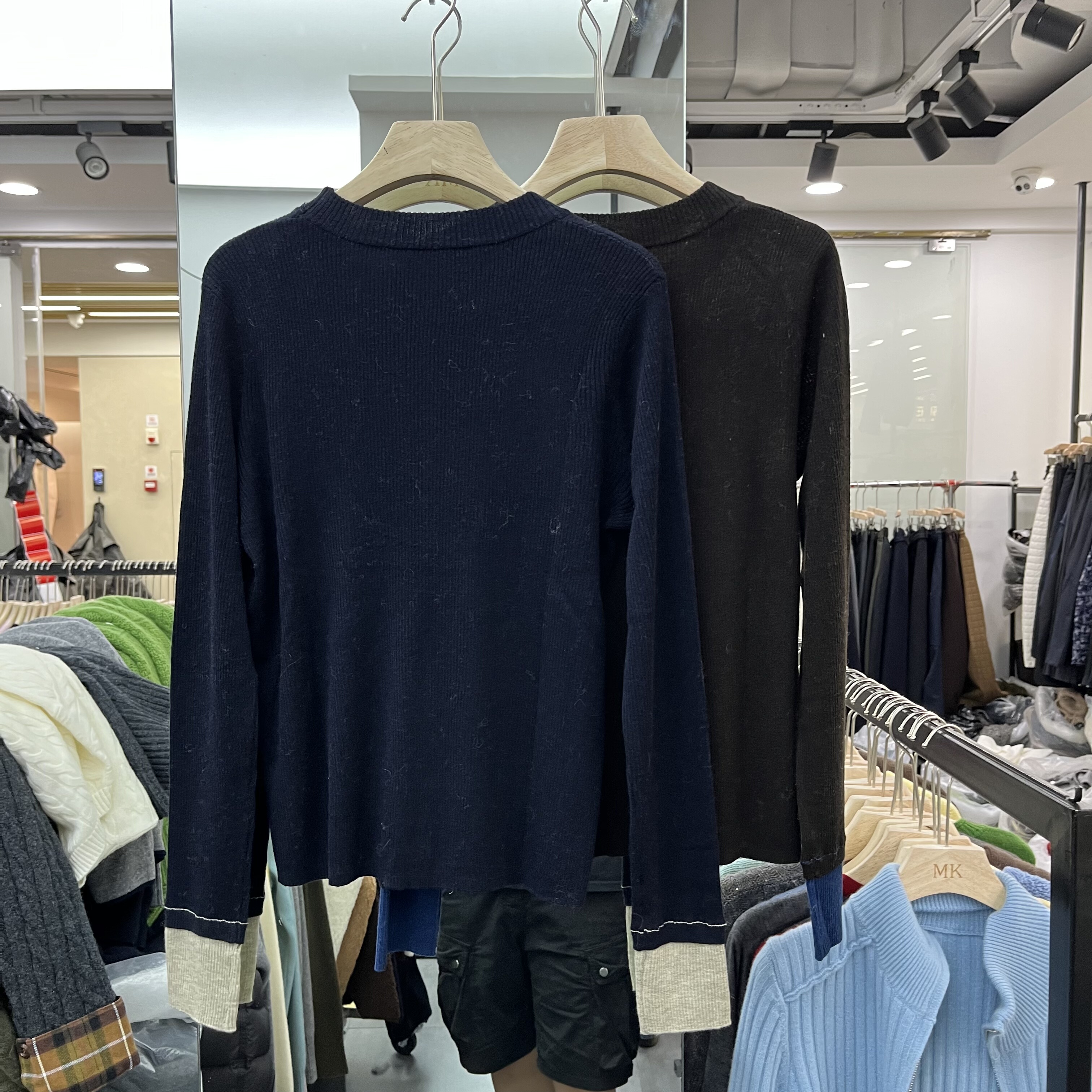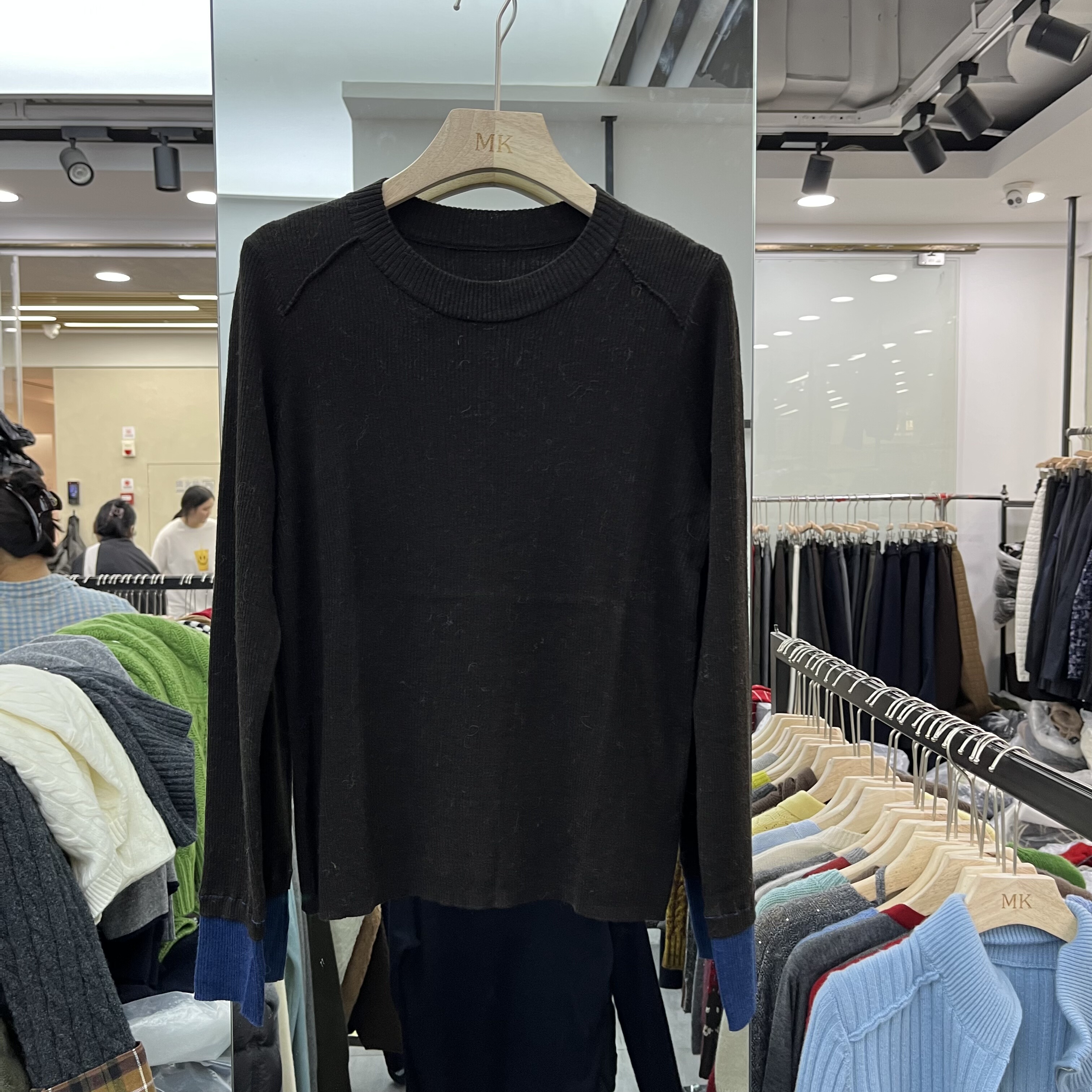 欧洲站2025秋季新款女士圆领袖口拼色细羊毛长袖毛衣欧货宽松针织