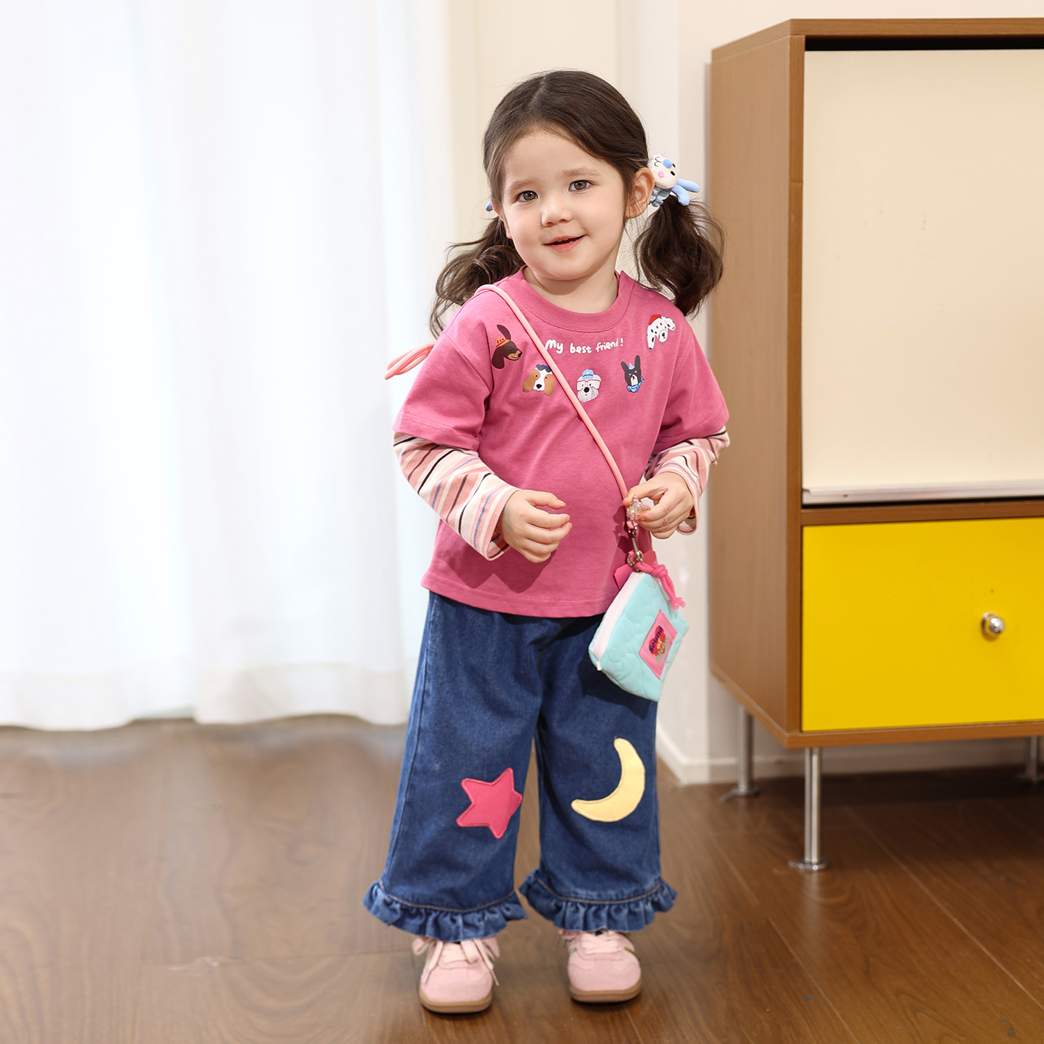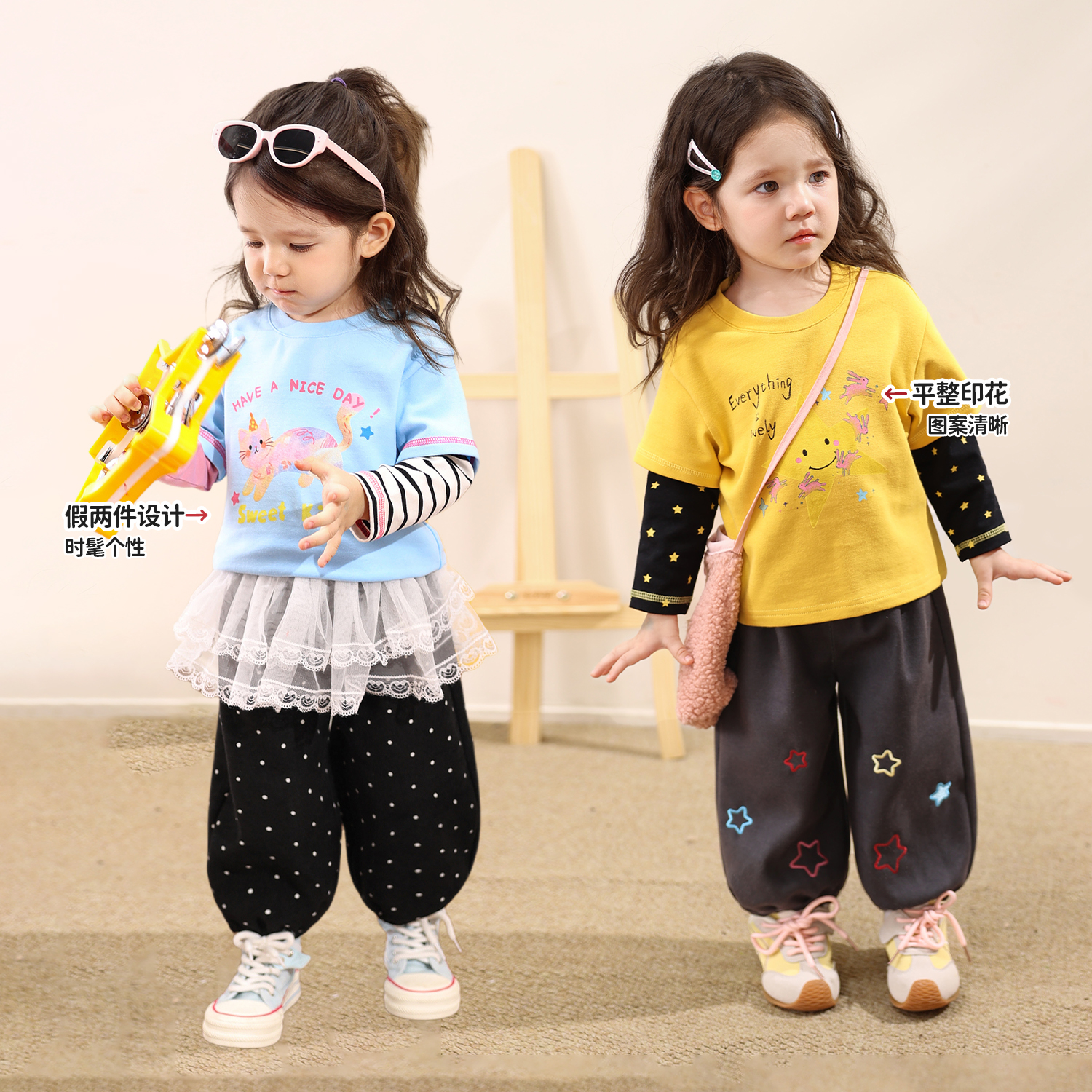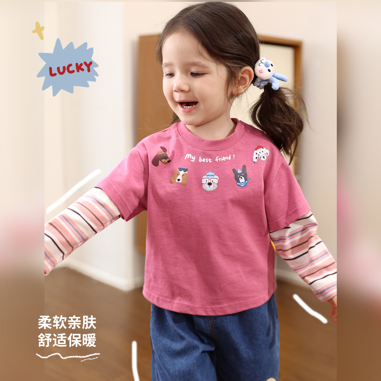 小o爸女婴童 女宝宝假两件t恤2025冬季新款婴儿全棉印花卡通上衣