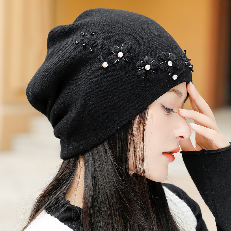 帽子女冬季毛线帽保暖针织帽花朵堆堆帽女士包头冷帽护耳加厚时尚