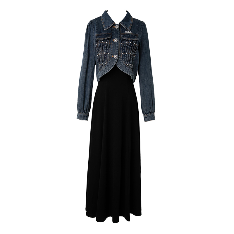 菲梦伊时尚设计感套装女秋季法式赫本风黑色吊带连衣裙配牛仔外套