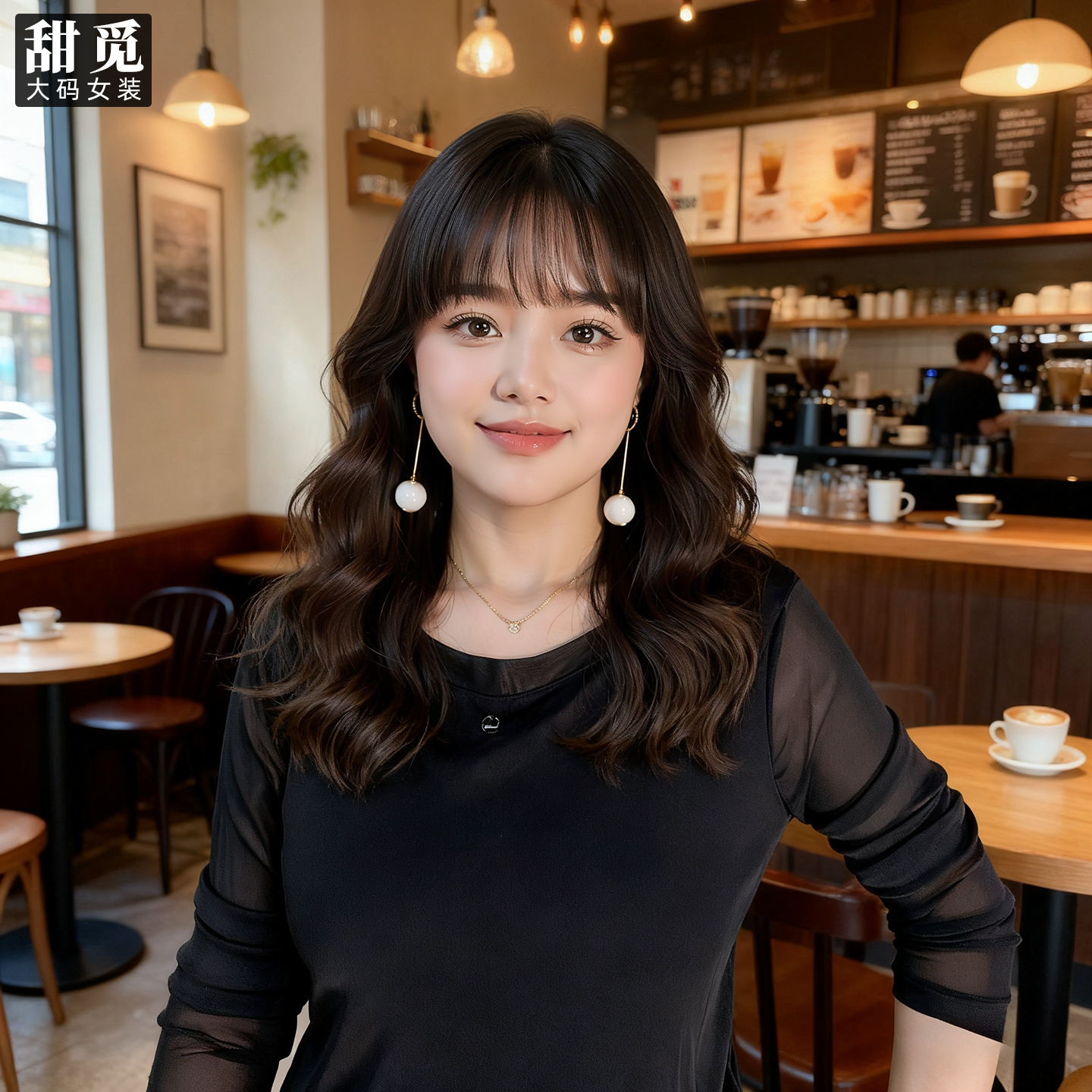 甜觅特大码女装2025春秋装胖mm300斤简约百搭长袖圆领网纱打底衫