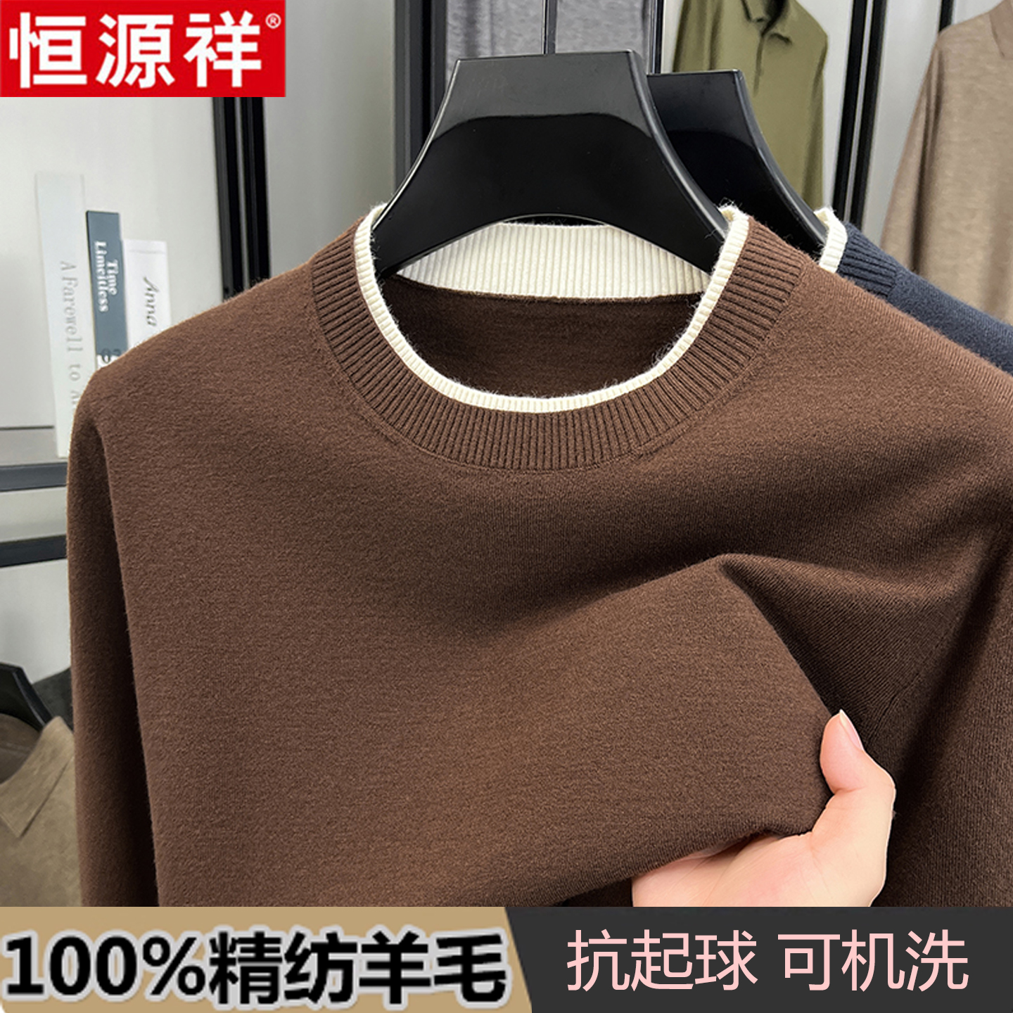 恒源祥春秋精纺纯羊毛衫男士薄款圆领毛衣假领针织打底衫长袖T恤