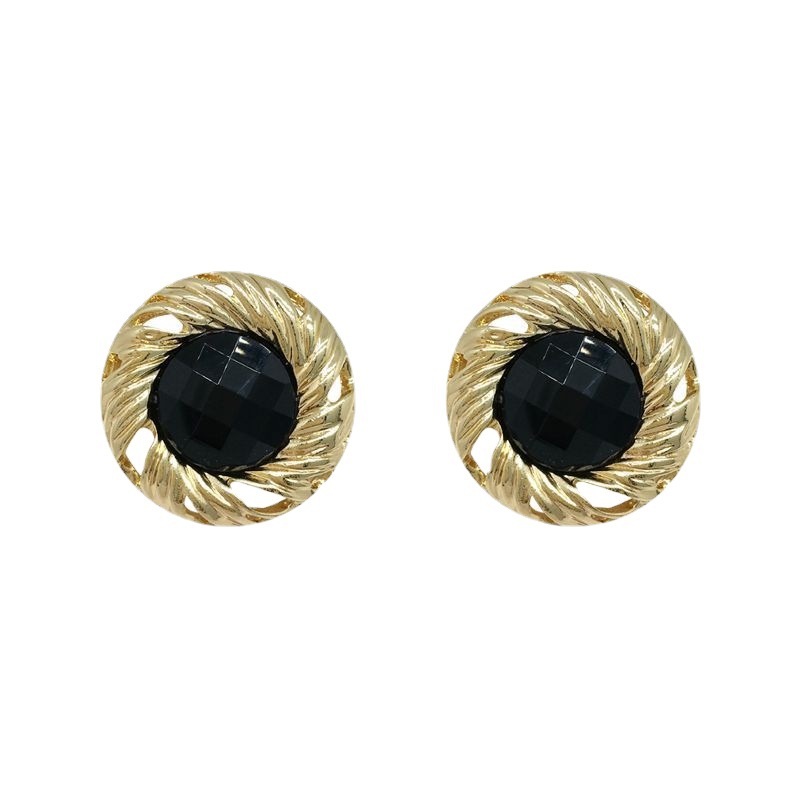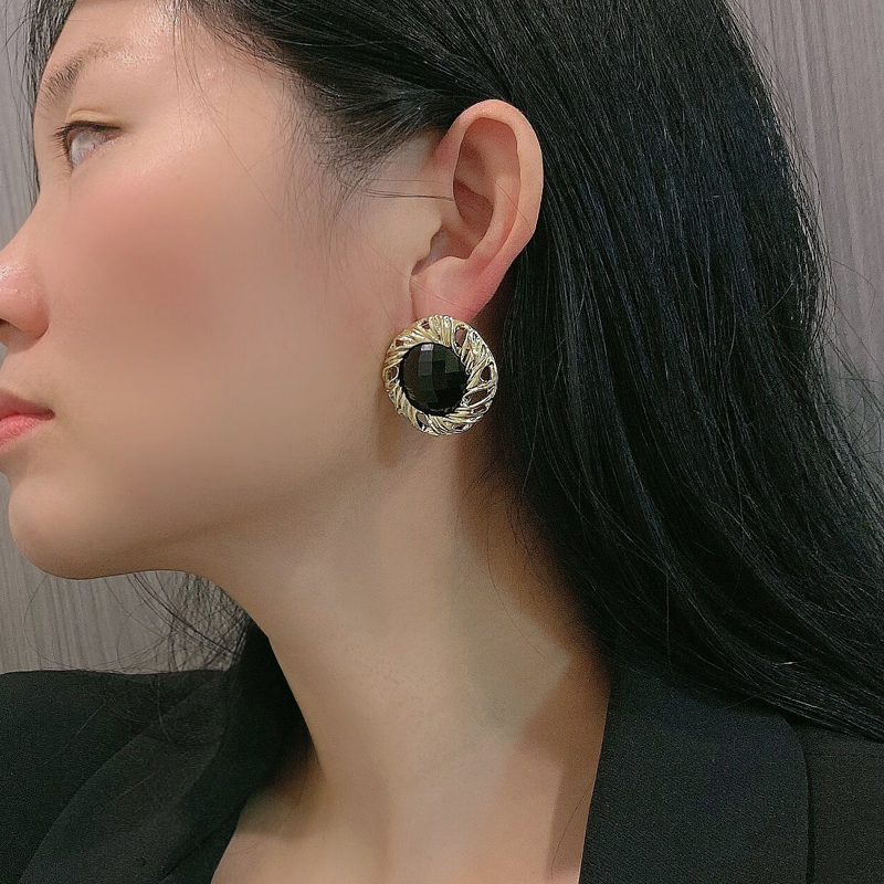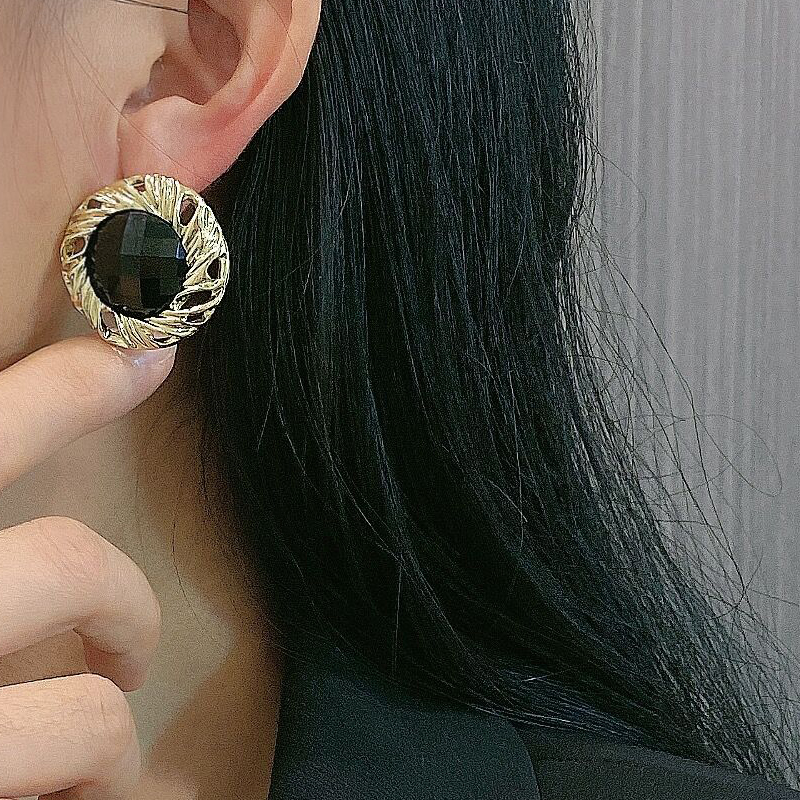 复古金属高级感黑宝石镶钻S925银针耳钉金属镂空简约时尚个性耳环