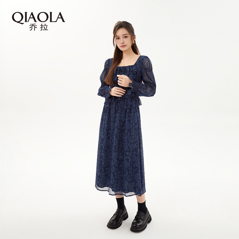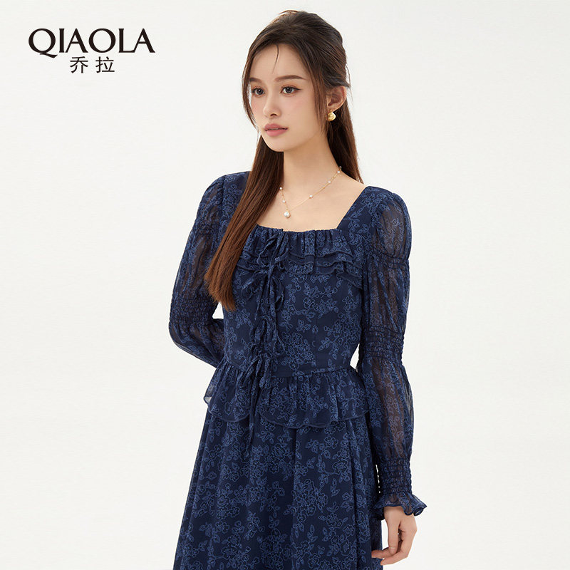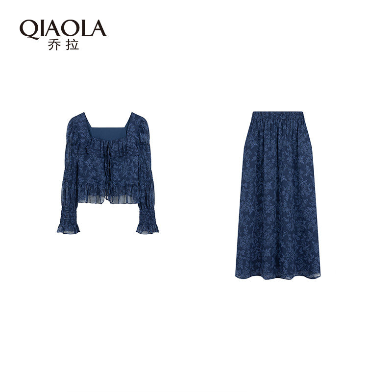 乔拉【夜阑星河】早春季新款时尚套装女蓝色方领雪纺衫上衣半身裙