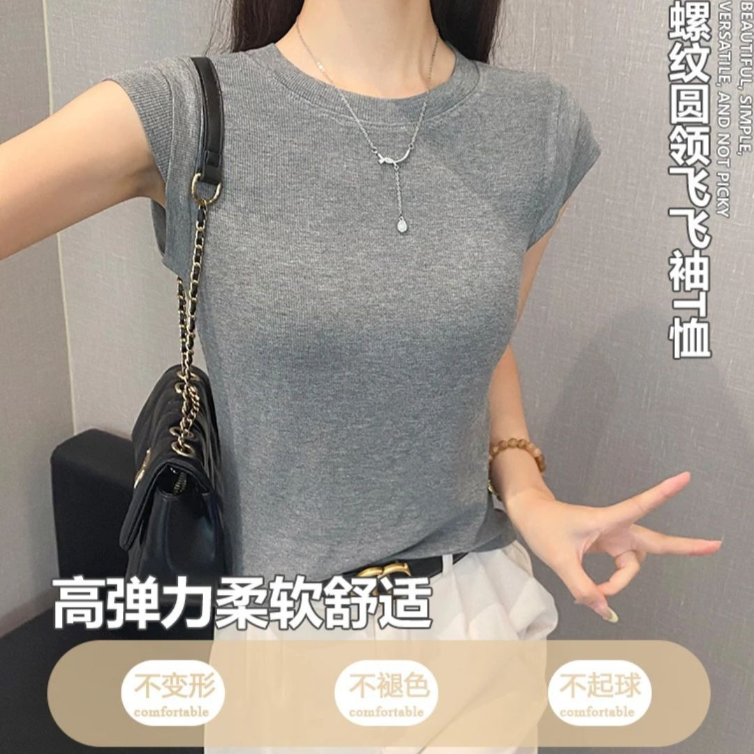 螺纹圆领飞飞袖T恤女夏季修身打底衫百搭显瘦短袖上衣百搭