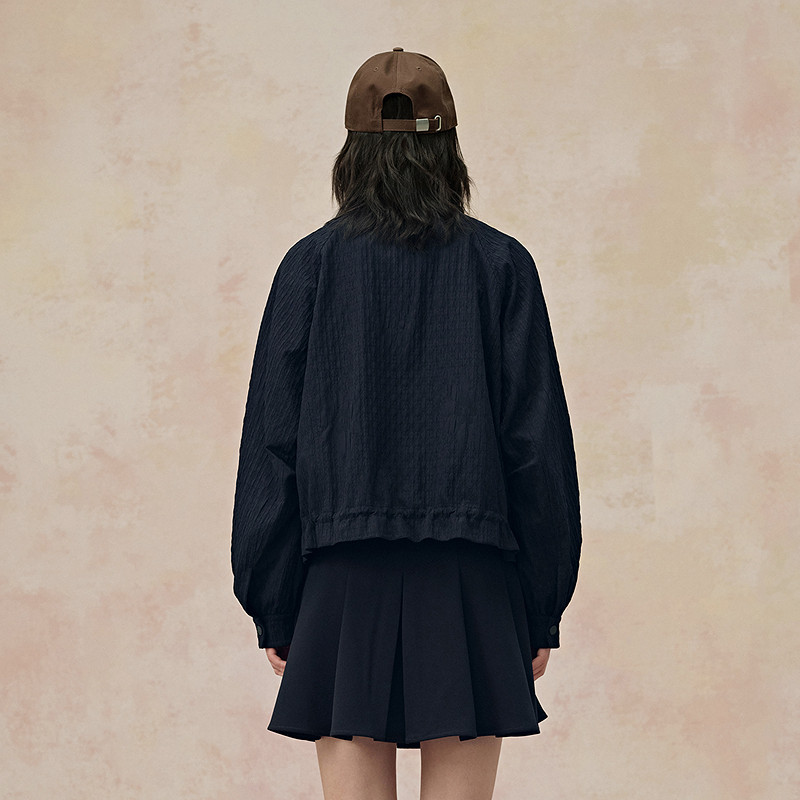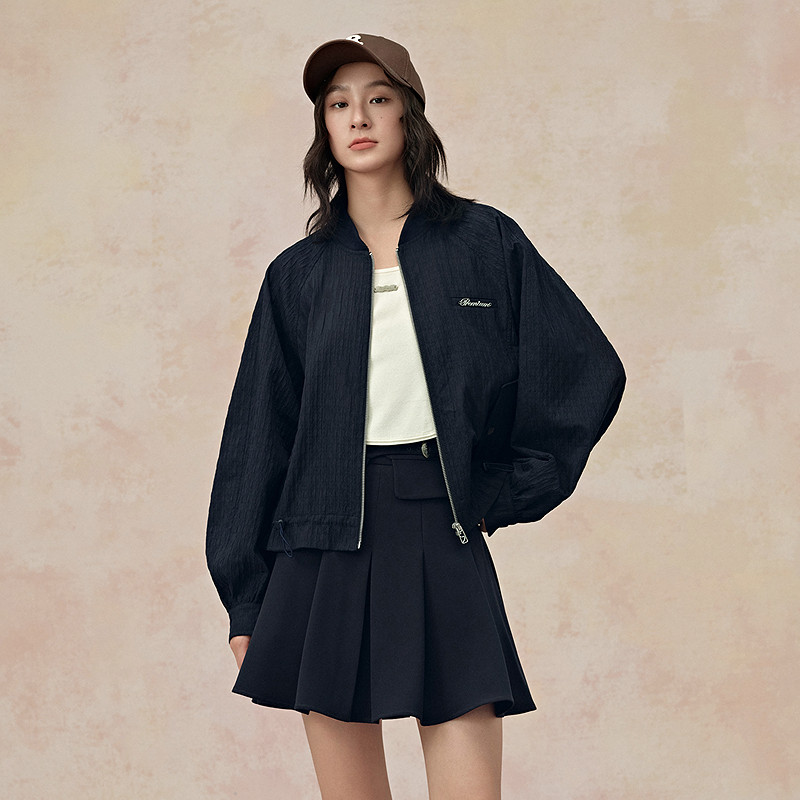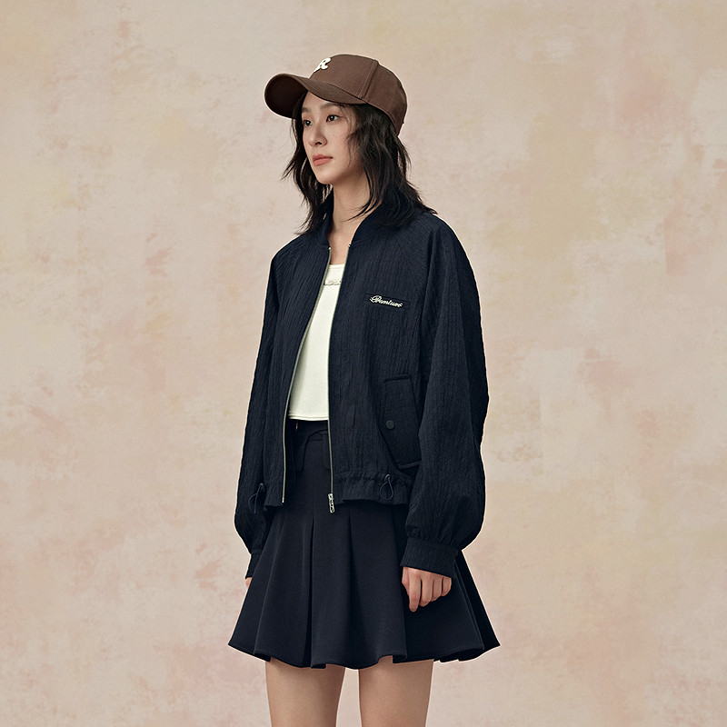 PIT复古纯色褶皱棒球服夹克女2026春肌理感廓形宽松外套上衣