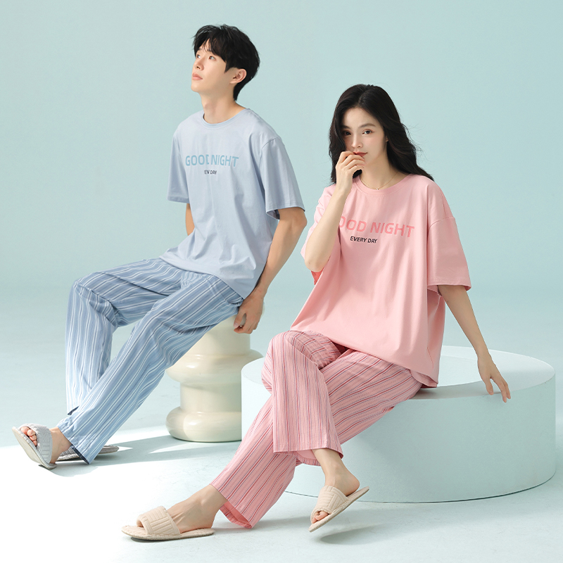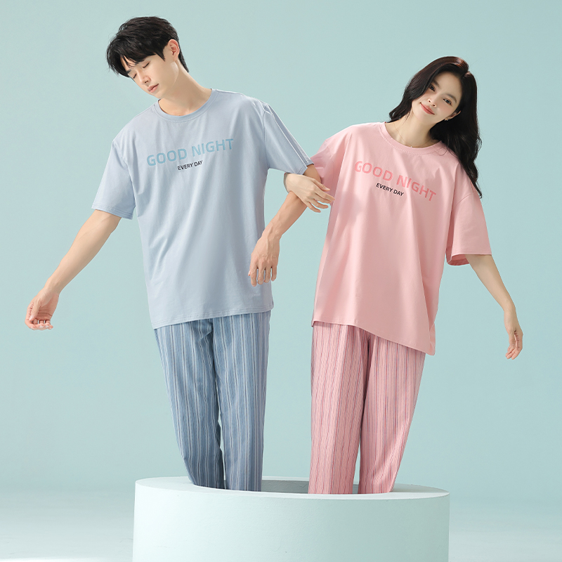 芬腾夏季情侣纯棉短袖圆领薄款套装宽松休闲男女士大码全棉家居服