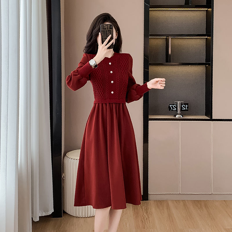 加厚红色连衣裙秋冬新款针织毛衣裙女圆领配大衣打底红裙子