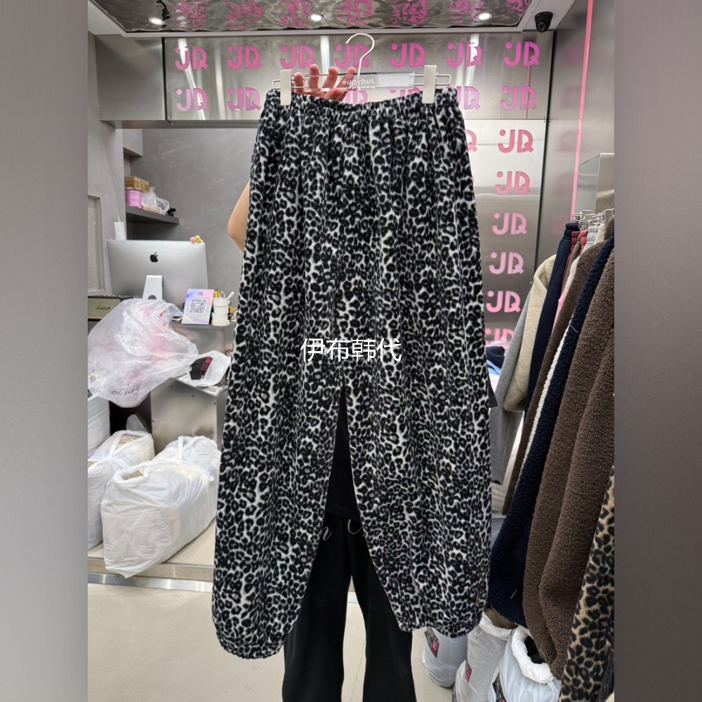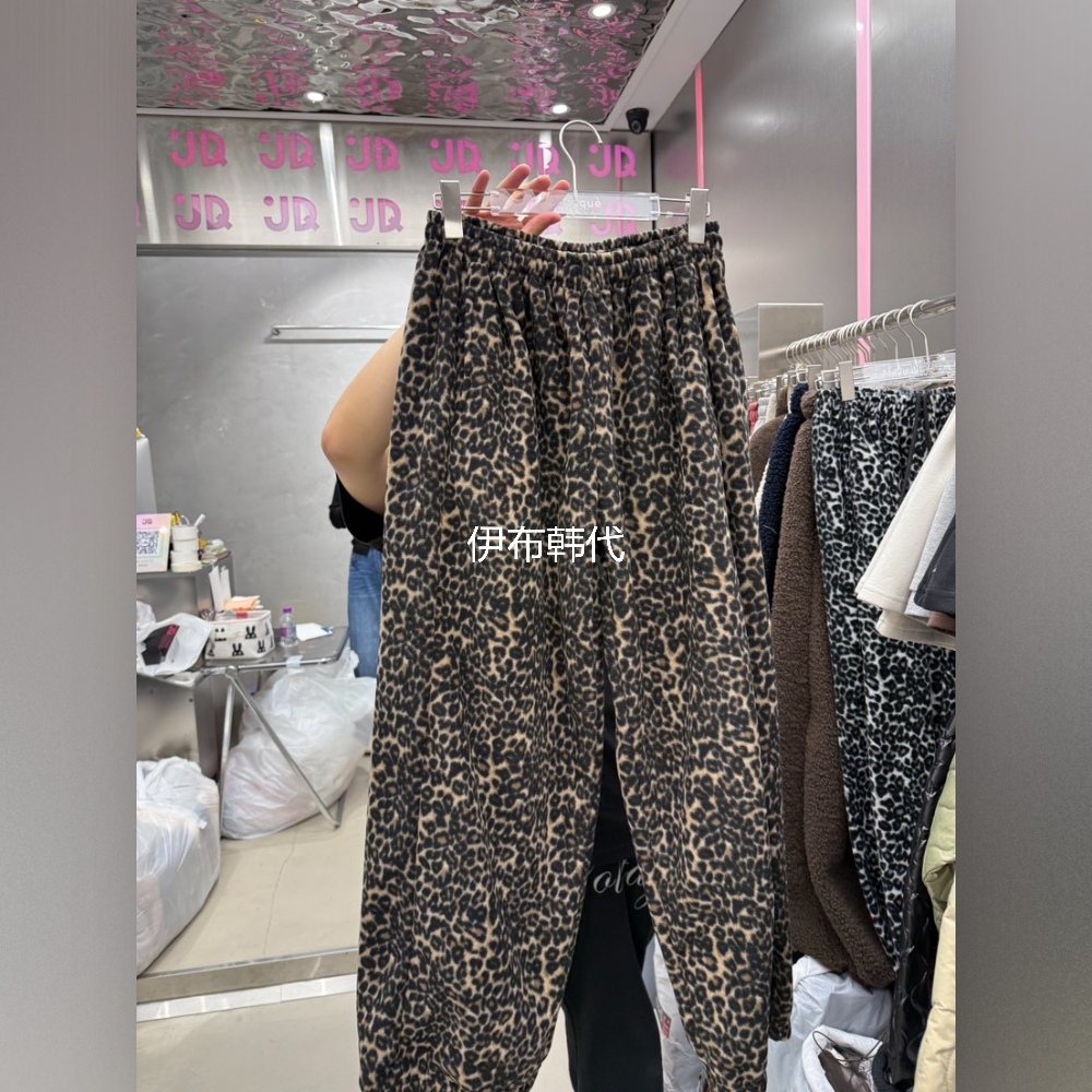 JUDYQUE韩国东大门正品代购25冬款 松紧腰珊瑚绒豹纹宽松束脚卫裤