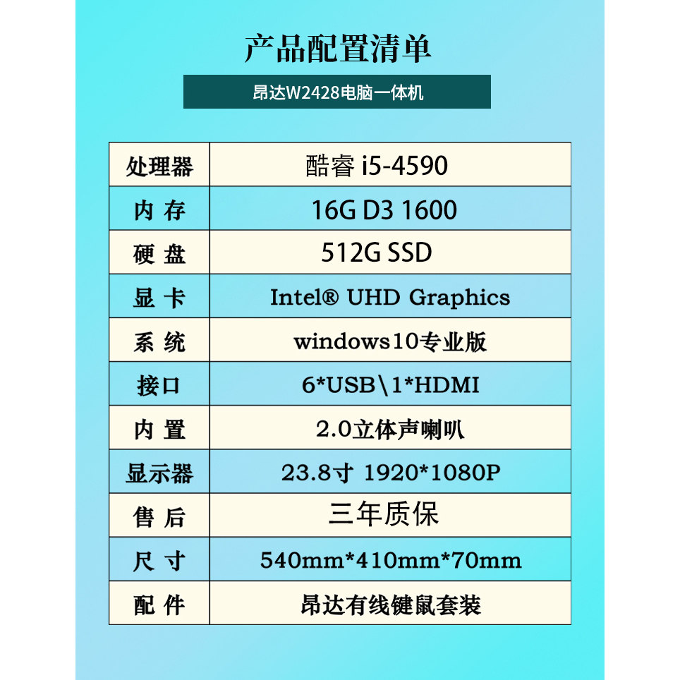 昂达ONDA24寸电脑一体机 i5-4590 16G 512G WiFi商务办公家用整机