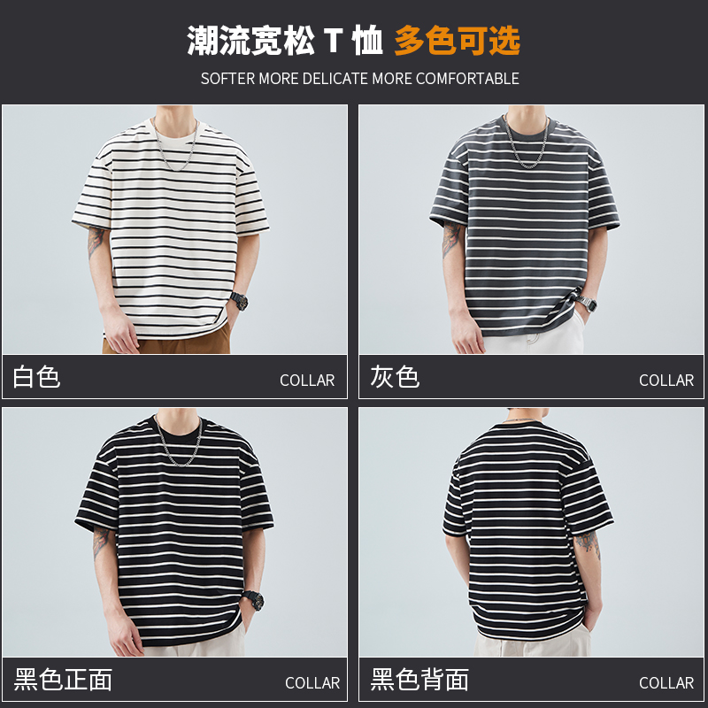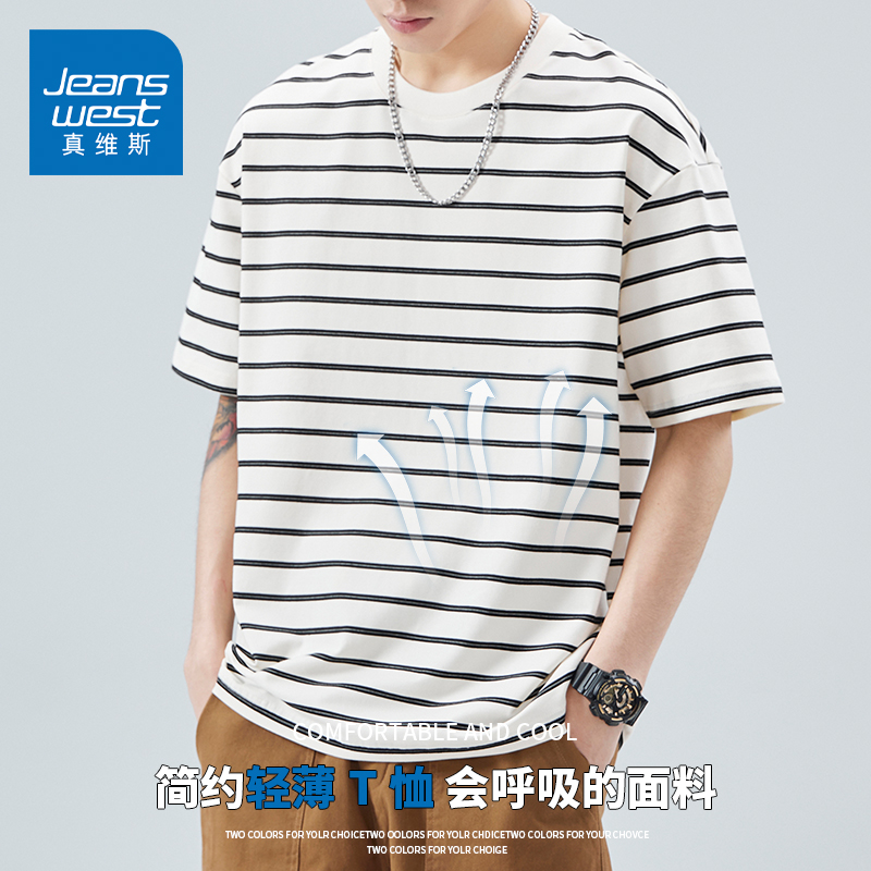 KZH真维斯条纹短袖T恤男夏季新款宽松时尚打底衫重磅圆领休闲上衣