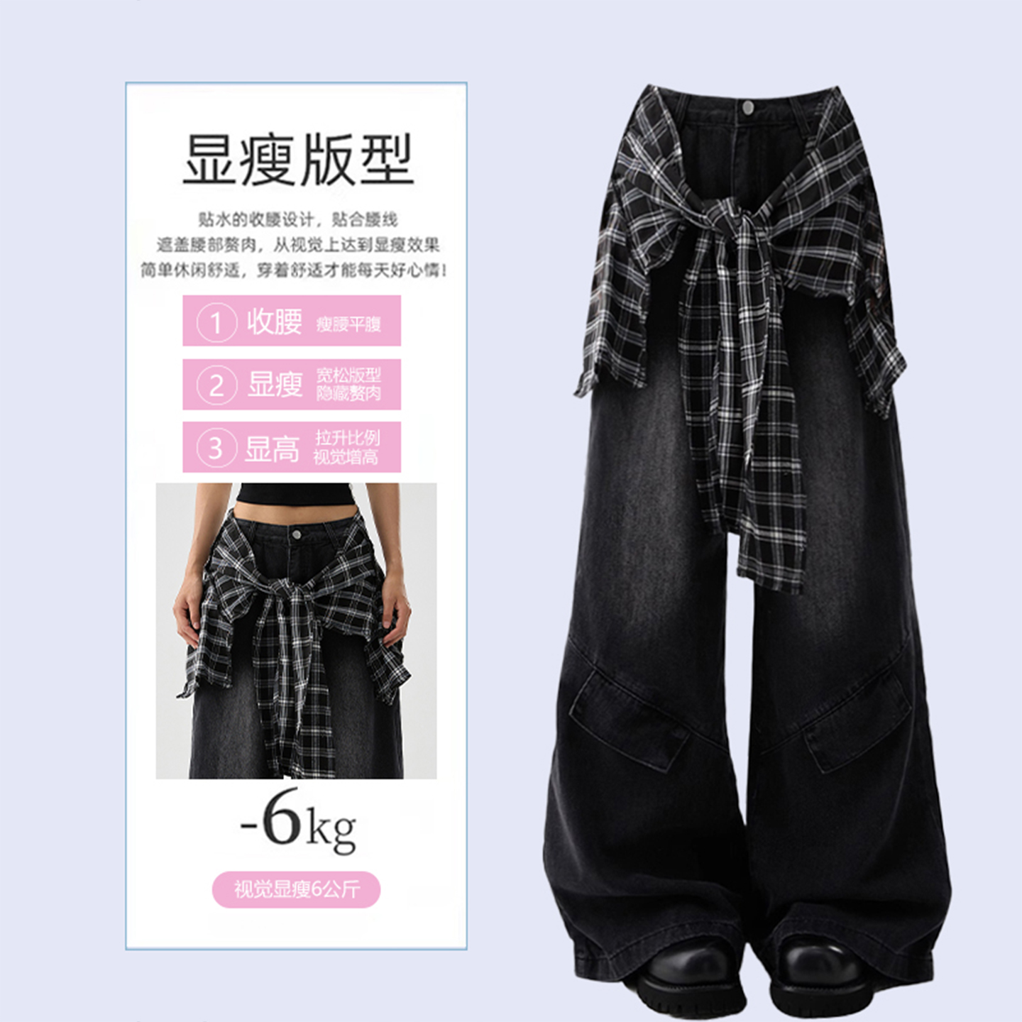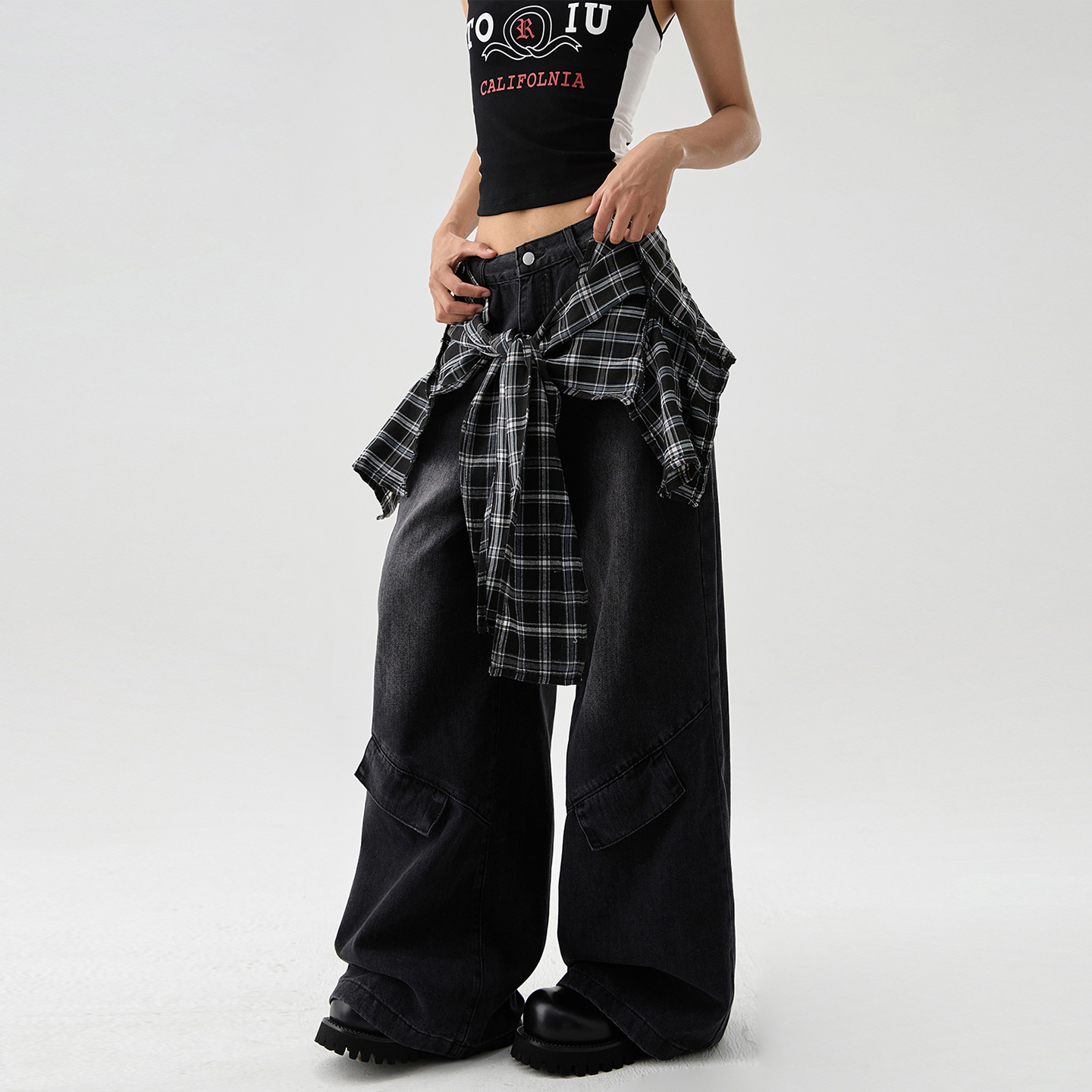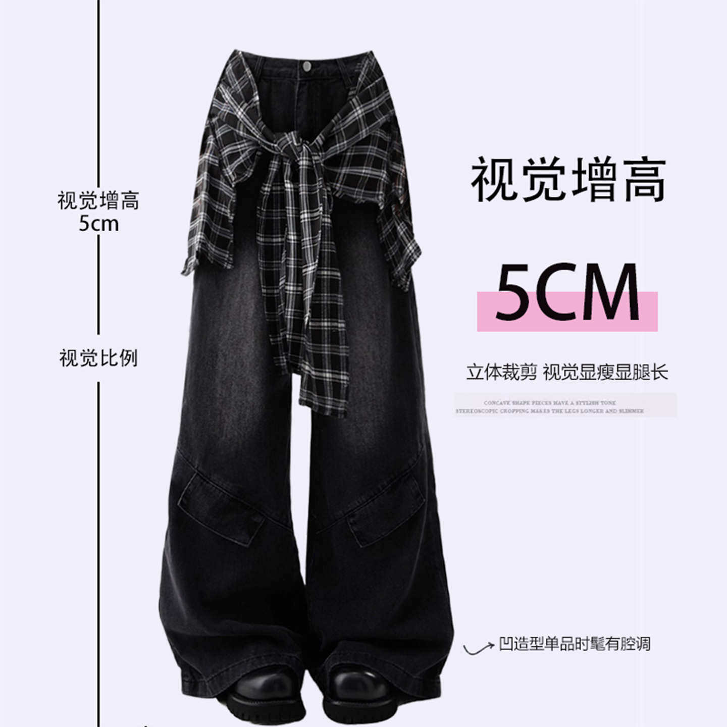 特大码黑色高级感做旧水洗美式风直筒牛仔裤女胖mm宽松百搭长裤子