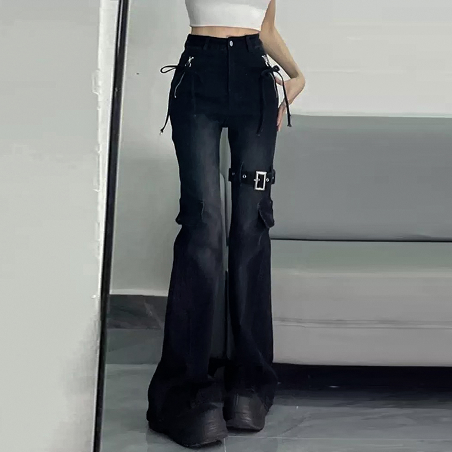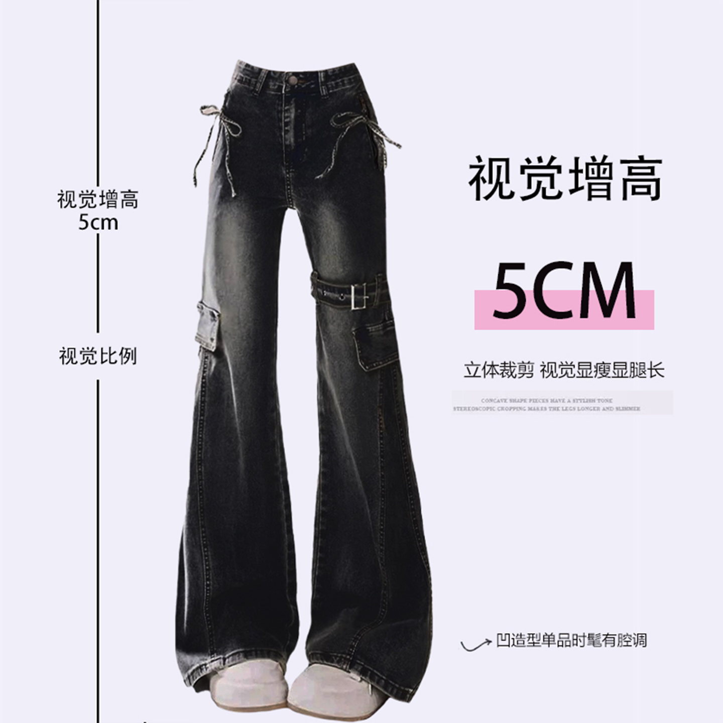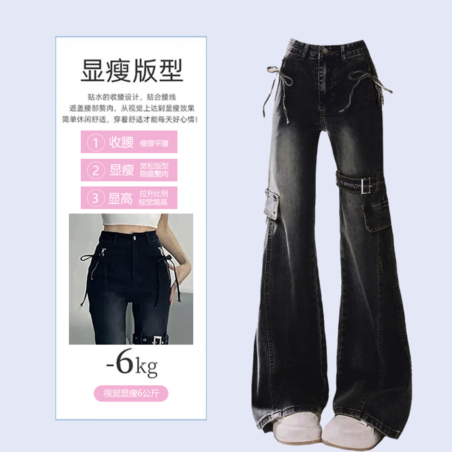 特大码胖mm美式复古辣妹蝴蝶结微喇牛仔裤女黑色显瘦弹力马蹄裤子