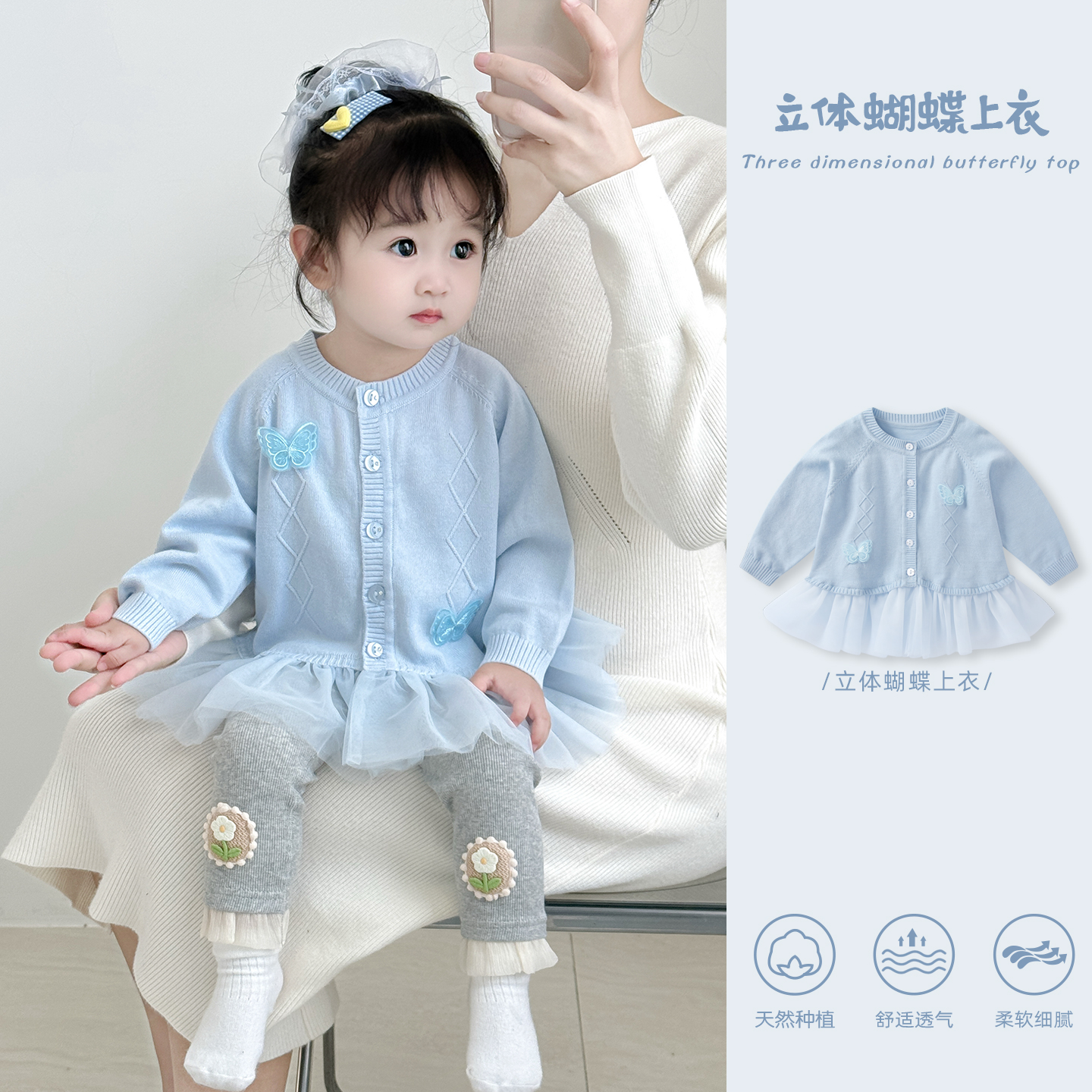 婴儿针织套装秋冬女宝宝网纱裙开衫打底裤毛衣两件套女童秋装衣服