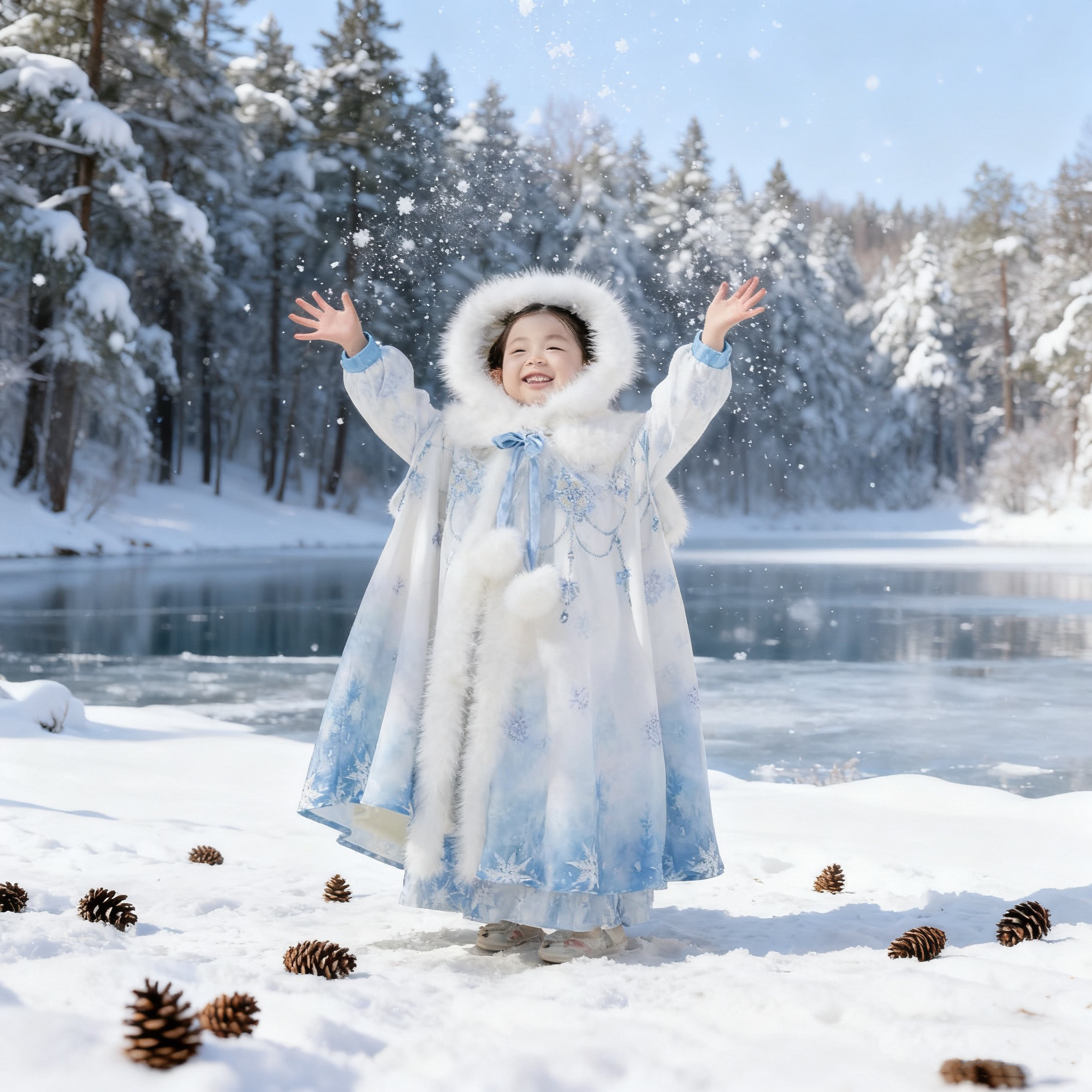 冰雪奇缘蓝色水晶加绒加厚女童汉服冬款古风超仙加绒连衣裙斗篷