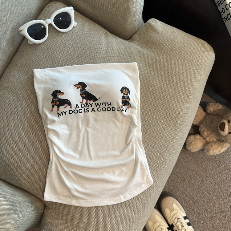 灰色腊肠狗印花抹胸背心女夏季新款纯欲风外穿带胸垫褶皱收腰上衣