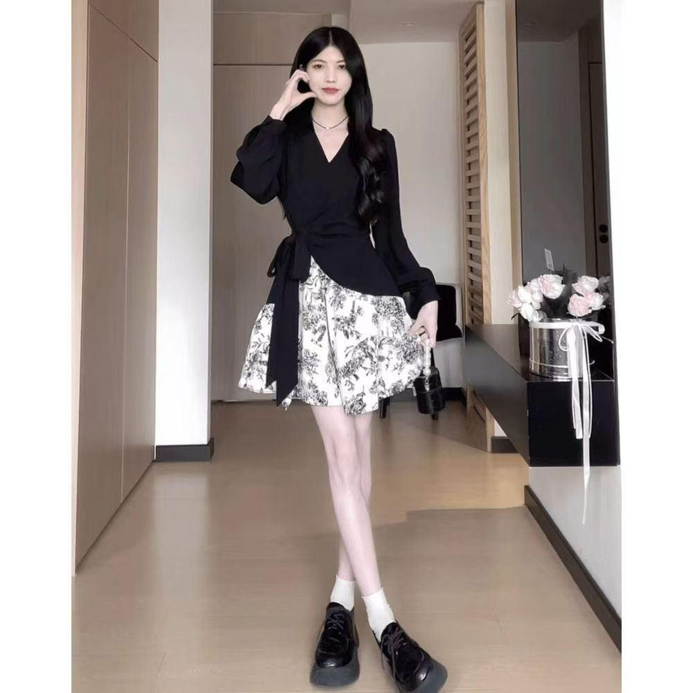 不规则长裙春秋季收腰显瘦设计水墨新款2024拼接长袖感收连衣裙