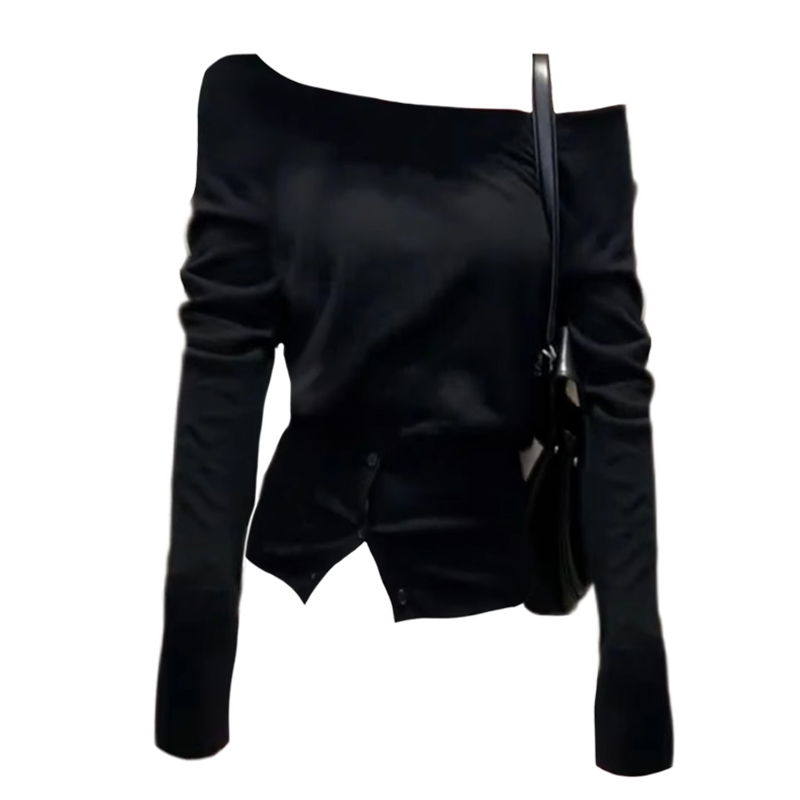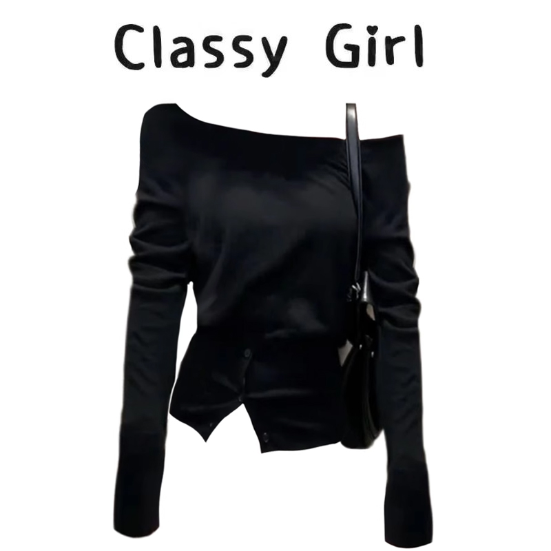 Classy girl 高级感不规则斜肩长袖t恤女早秋露肩显瘦别致上衣潮