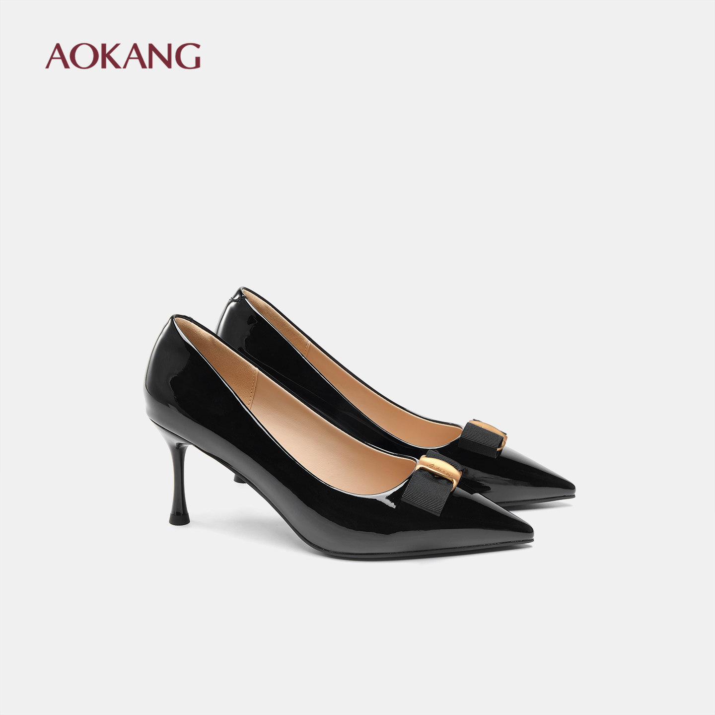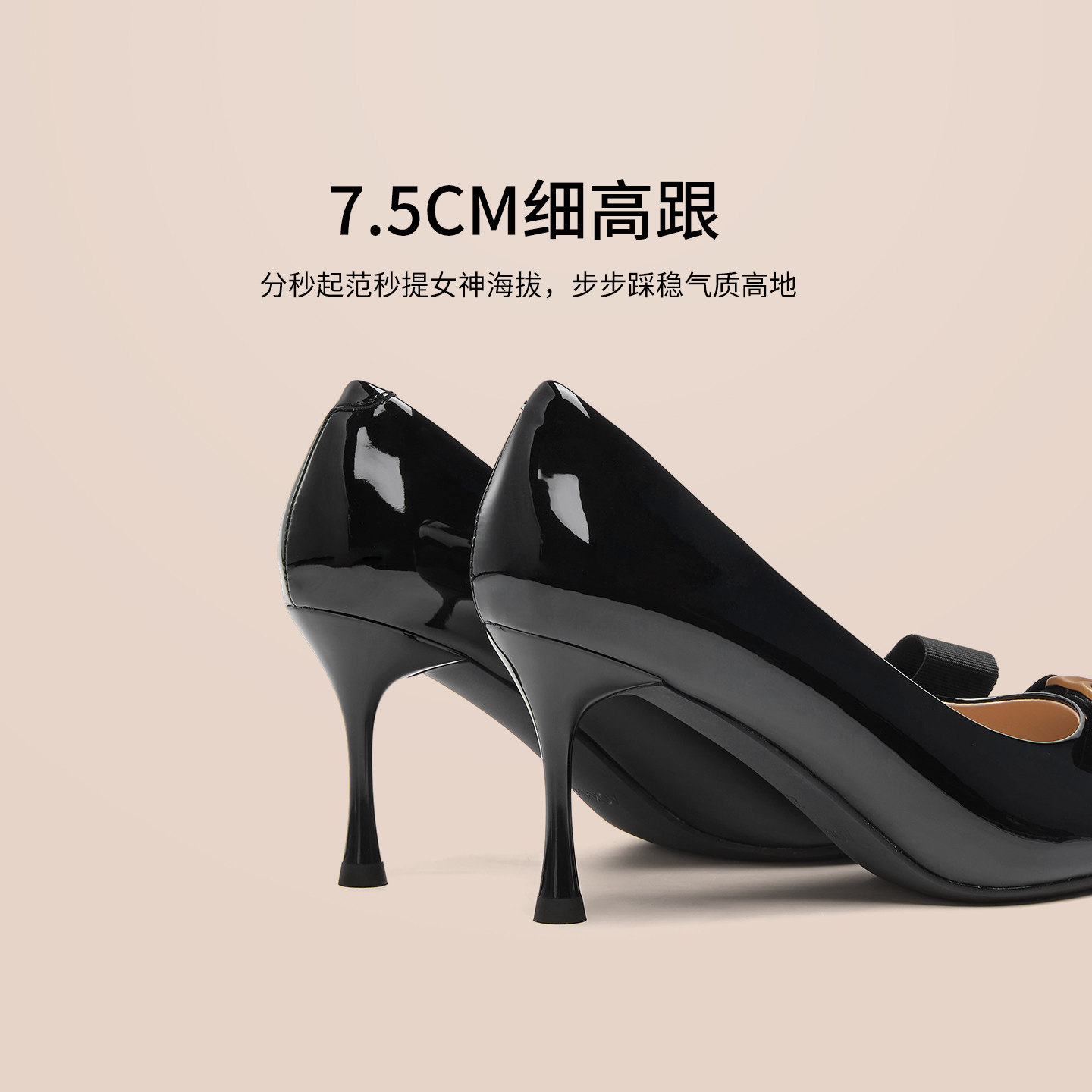 奥康 女鞋2025秋季新款尖头浅口蝴蝶结婚鞋细跟单鞋漆皮高跟鞋女