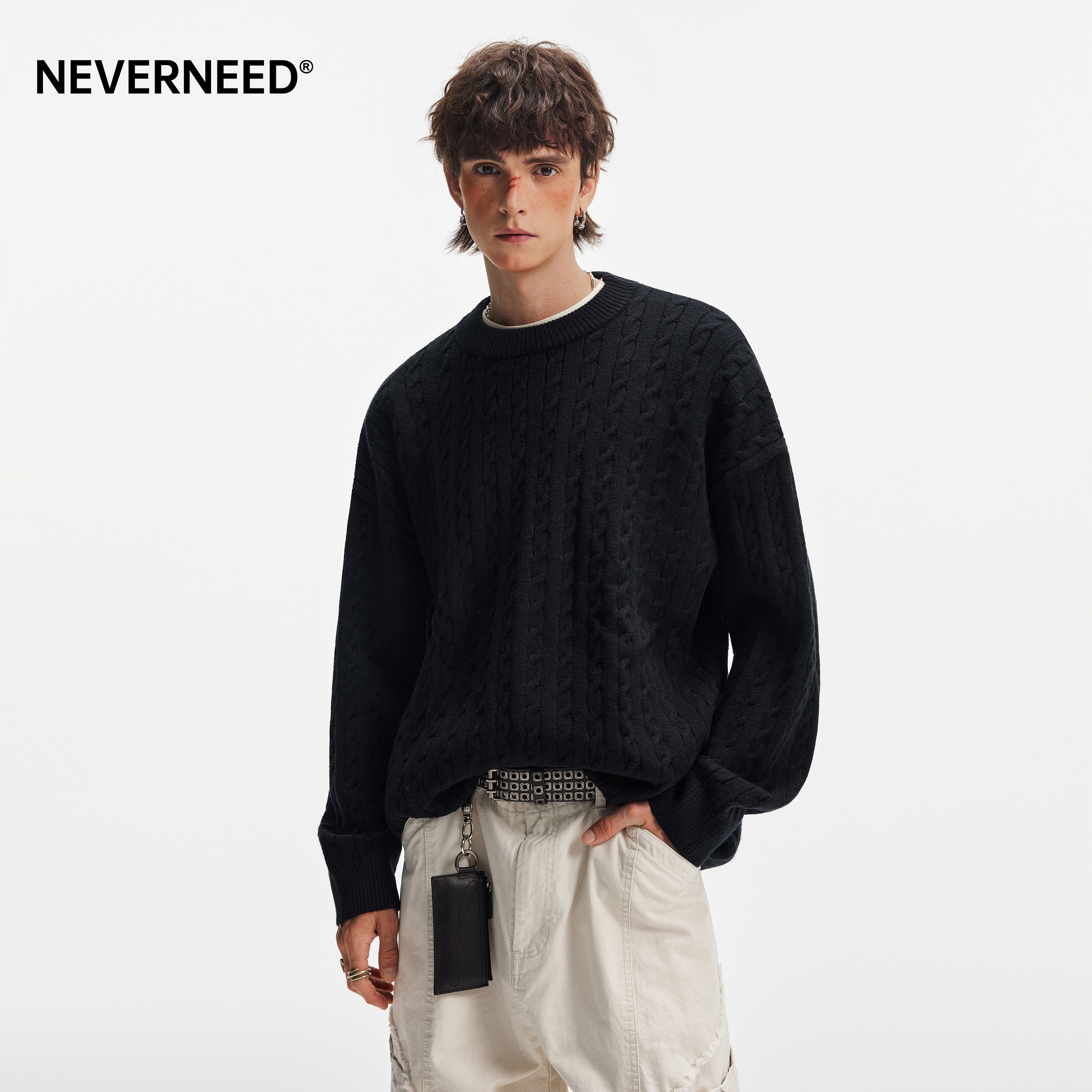 NEVERNEED麦穗麻花圆领毛衣男女
