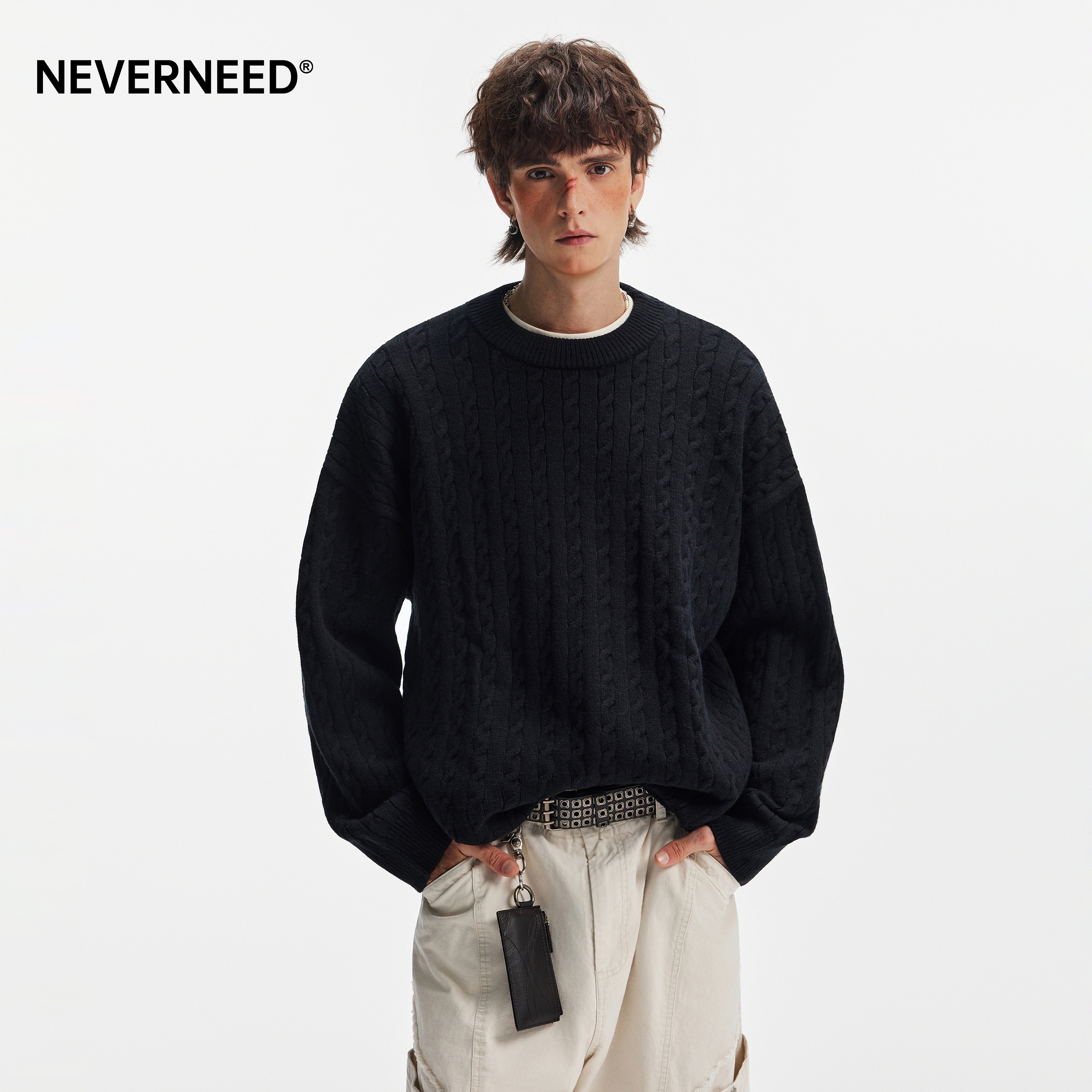 NEVERNEED麦穗麻花圆领毛衣男女秋季美式复古纯色情侣内搭针织衫