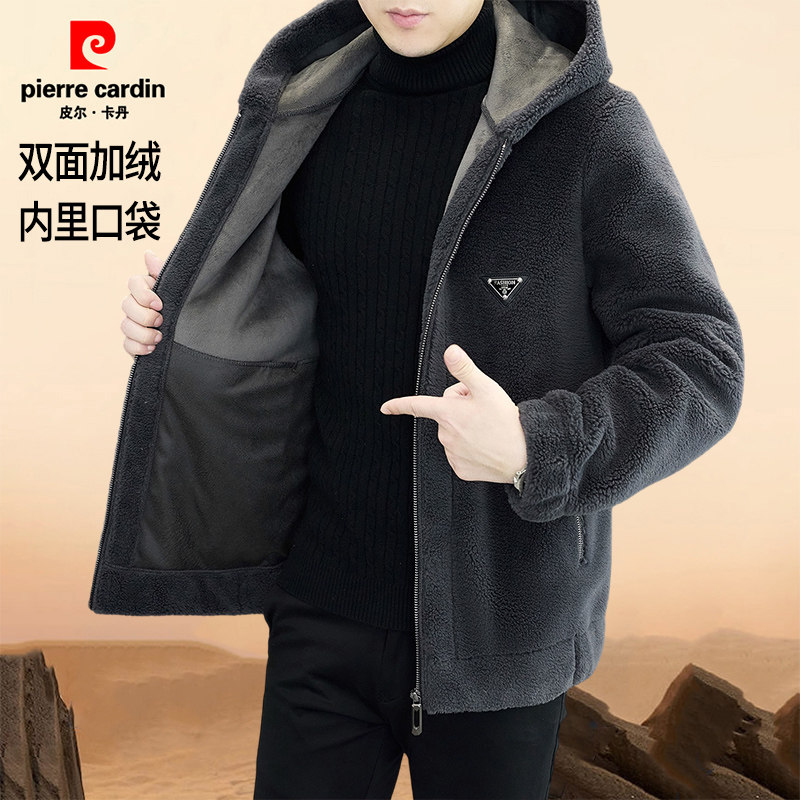 皮尔卡丹秋冬新款男士外套两面绒保暖连帽皮毛一体夹克男装上衣服